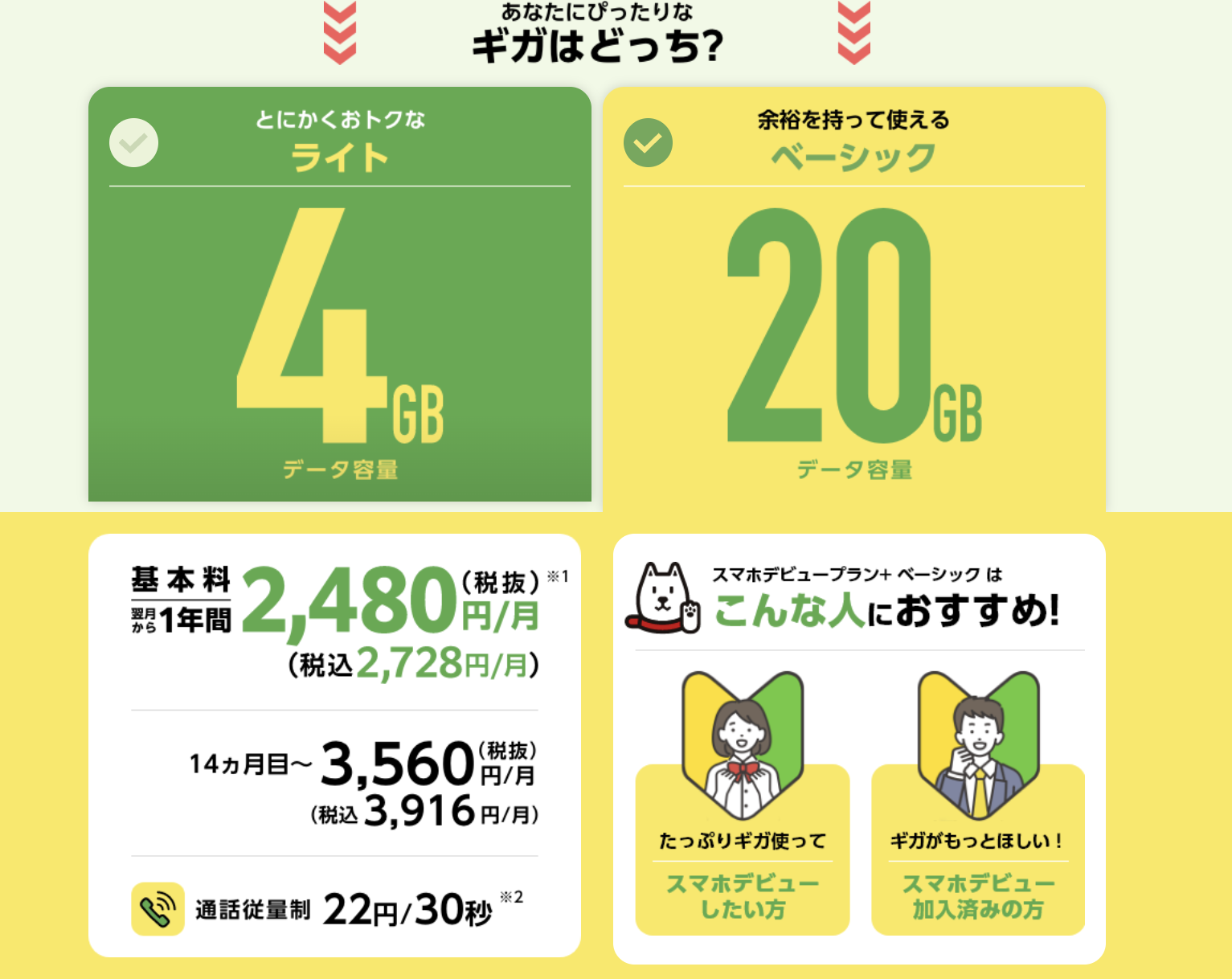通信料金にもご注目。特別に用意された「スマホデビュープラン+」適用で1年間はデータ20GB 月額2,728円!2年目以降もずっと3,916円。