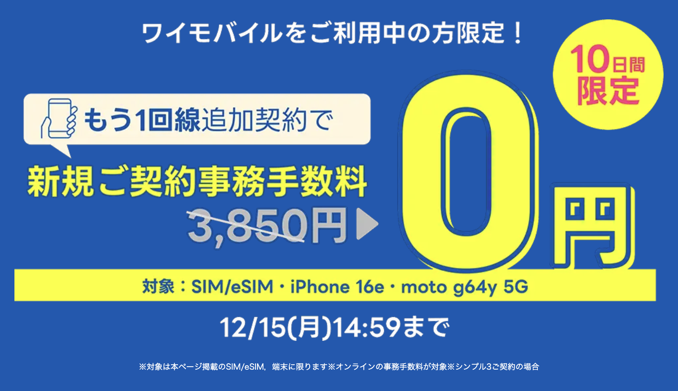 ワイモバイルは既存ユーザー向けの新しいキャンペーンを開始した。12月15日14:59までの期間中、2回線目(以降)の新規契約で事務手数料が無料。