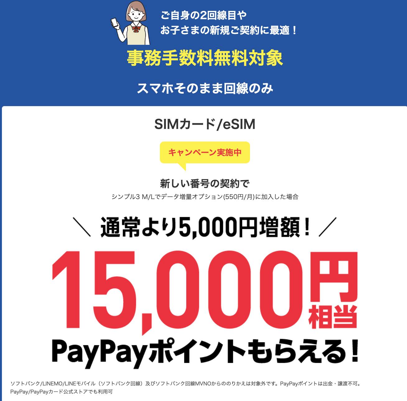 対象になるのは「SIM/eSIM」「iPhone 16e」「moto g64 5G」の3種類で、SIM単体はシンプルM・Lプランの選択+データ増量オプション加入で15,000円分のPayPayポイント付与。