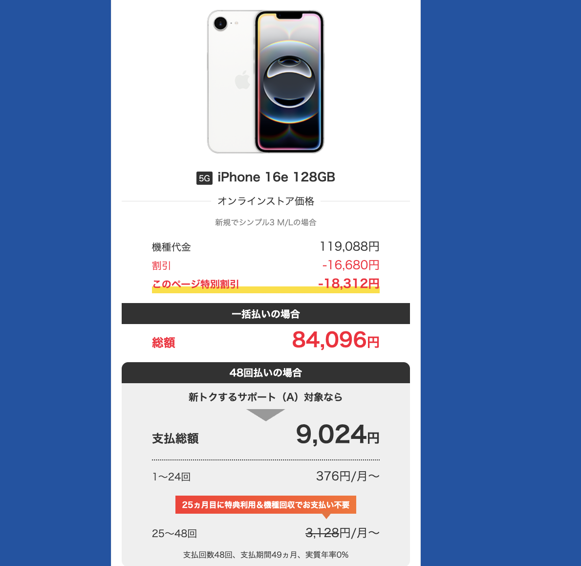 「iPhone 16e」は一括84,096円。通常16,680円に加えてWeb限定18,312円の特別価格で、ショップや家電量販店よりも有利になっている。