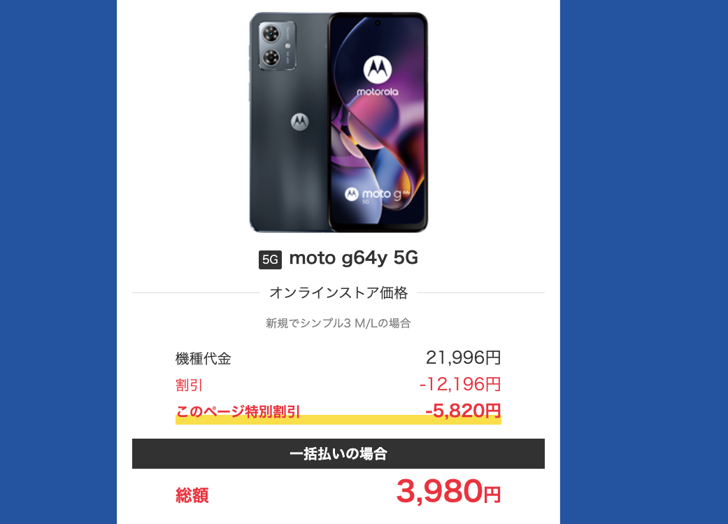 あまりお金をかけたくない人には「moto g64y 5G」の一括3,980円もお勧め。