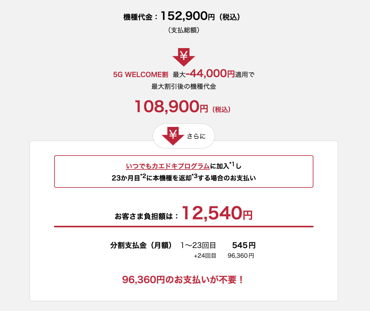 30GBの通信料金込みで3,515円しか発生しない。もちろん事務手数料や端末返却時の追加料金はなし。一括購入でも10万8,900円とアップル公式価格より約2万円お得。