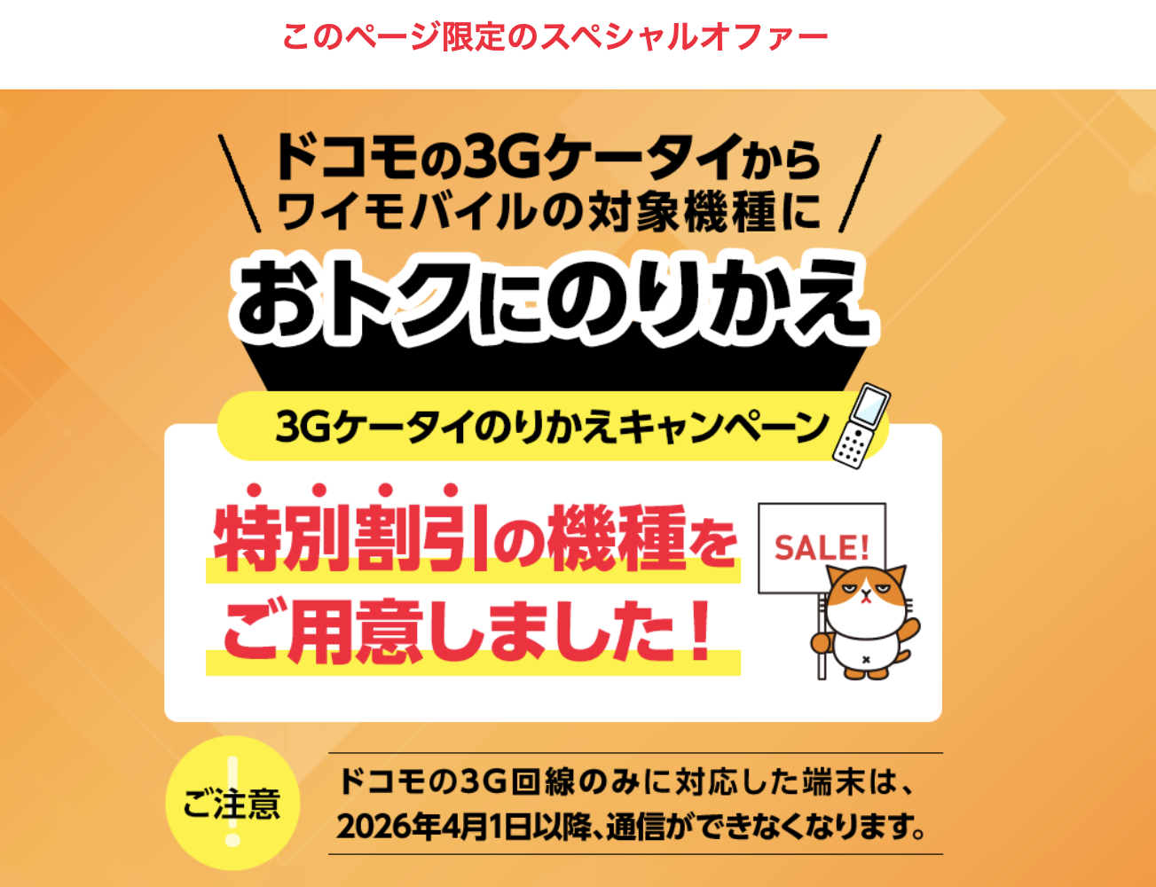 ワイモバイルはドコモのガラケー(3G回線)利用者向けの乗り換えキャンペーンを開始した。
