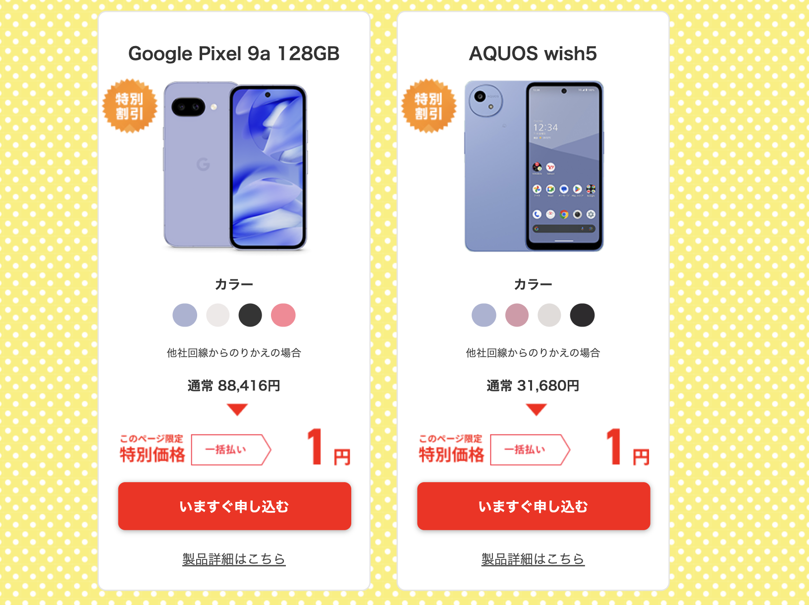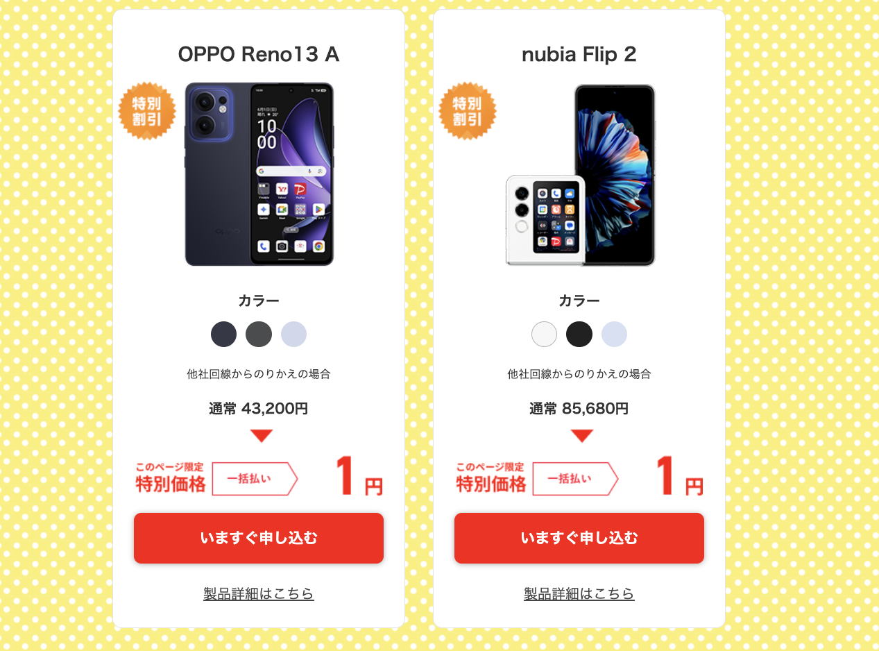 4G/5Gからの乗り換えよりも大型割引が用意され、「Pixel 9a」「OPPO Reno13 a」「nubia Flip 2」「AQUOS WISH5」 「らくらくスマートフォンa」「かんたんスマホ4」の計6機種がMNP一括1円。