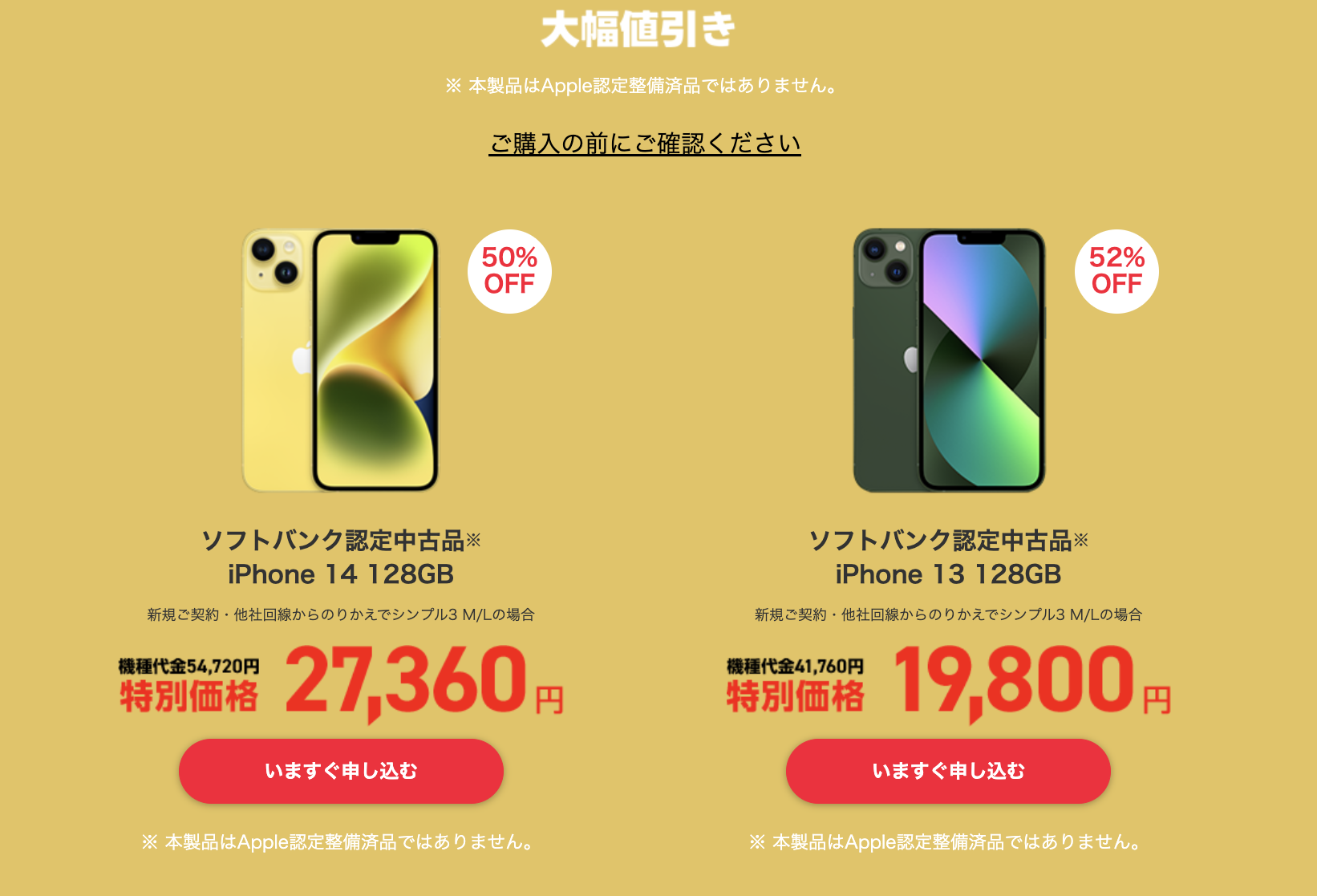 【新規OK】ワイモバイル、中古「iPhone13」 一括19,800円、「iPhone14」一括27,360円
