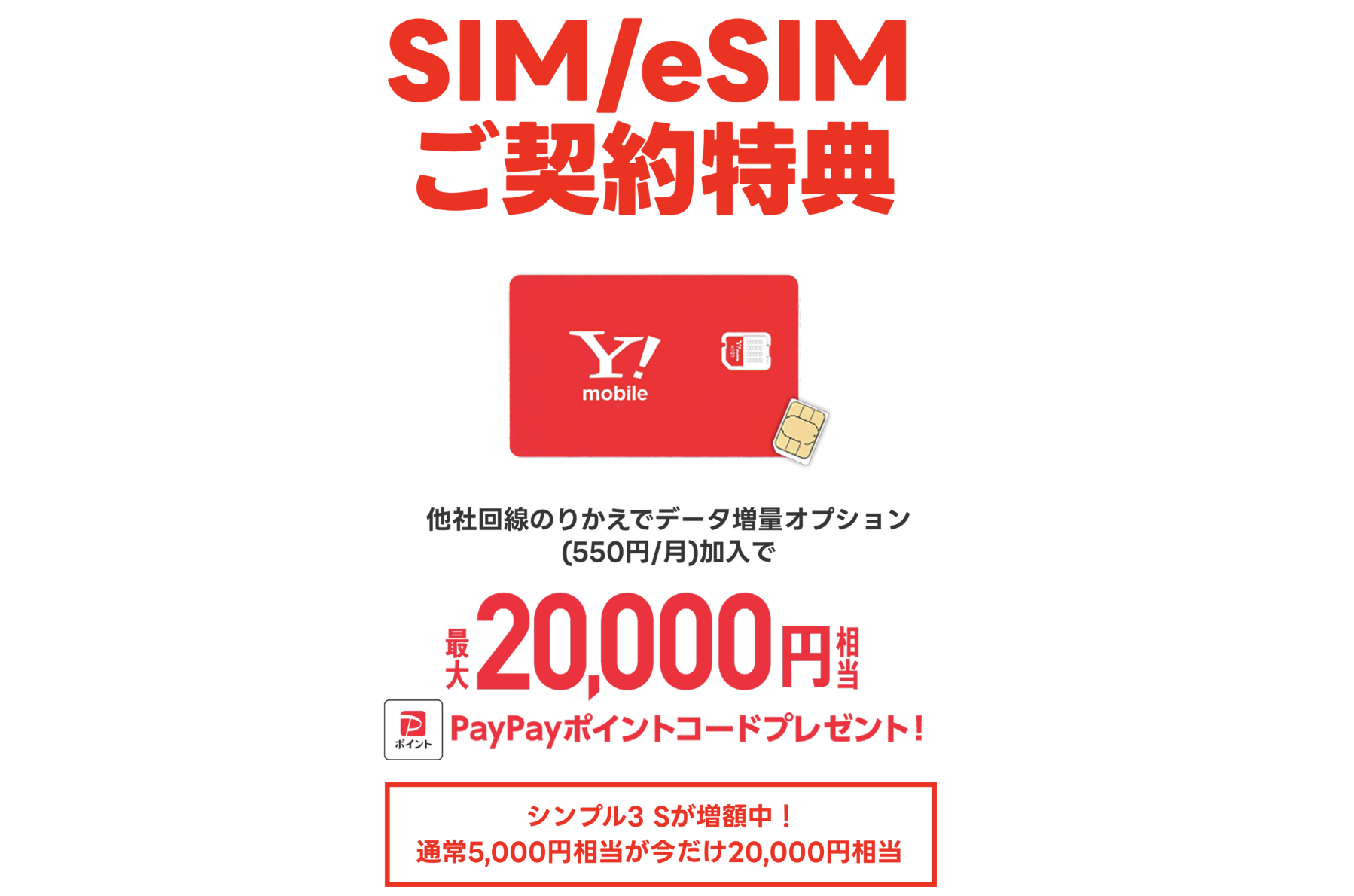 端末が不要は20,000円分のPayPayポイント獲得キャンペーンも実施中。珍しく小容量のSプランが申し込み対象となっており、あまりお金をかけたくない方にも朗報。