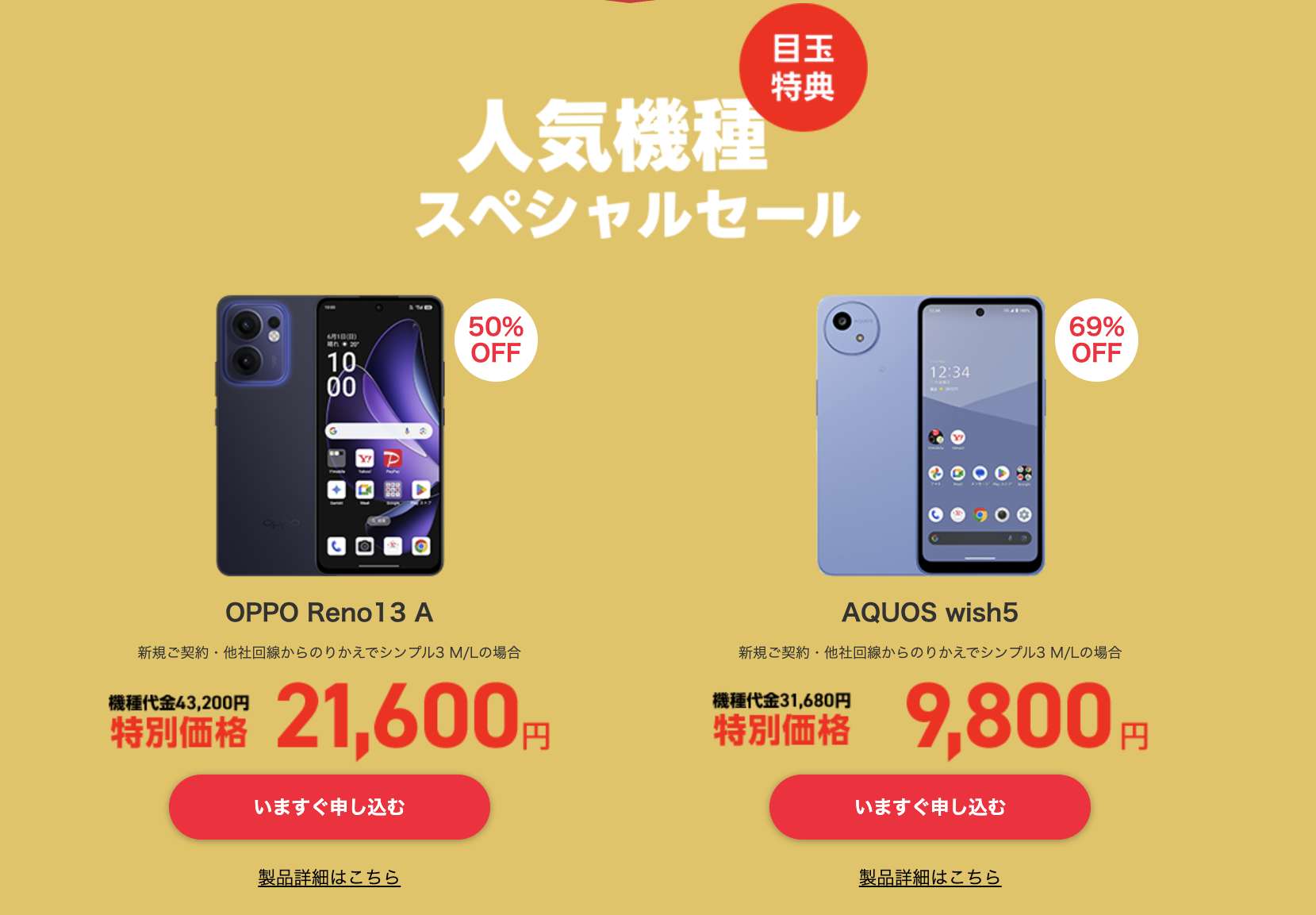 Androidでは「OPPO Reno 13A」が21,600円、「AQUOS wish5」が9,800円。同じくMNPの他、新規契約もOKで、乗り換え用の回線がない方も必見である。