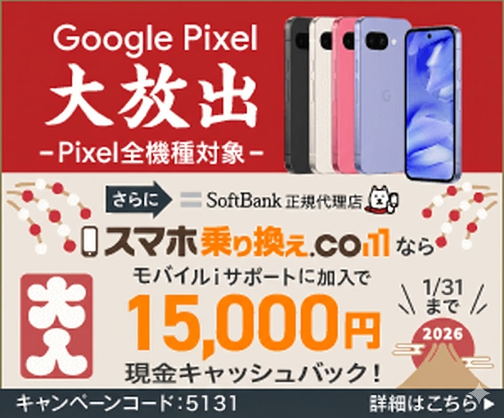 オンライン専用のソフトバンク代理店【スマホ乗り換え.com】にて、「Pixel」全機種に15,000円のキャッシュバックが追加された。(2026年1月31日まで)