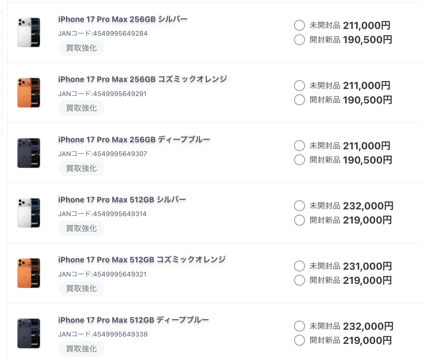 「iPhone17 Pro Max」の相場が爆上がりしている。つい先日、取引価格が定価+9,200円という記事を書いたばかりだが、1月23日時点で定価+16,200円を観測した。