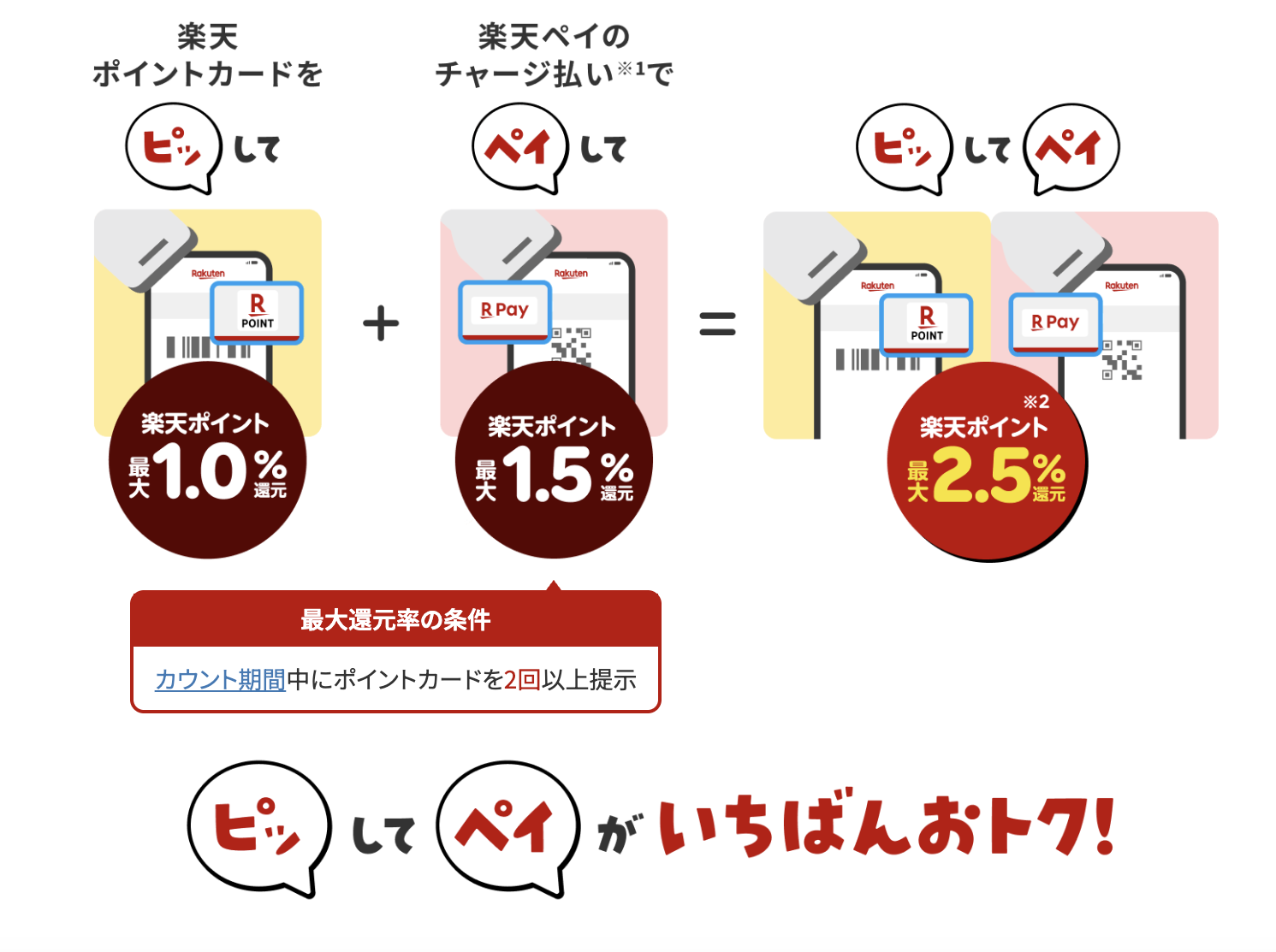 さらにリアル店舗ではQRコードの楽天ペイが活躍。楽天市場で貯めたポイントも利用可能で、月2回提示すれば還元率は最大2.5%。