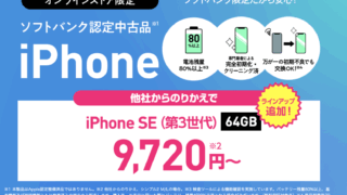 お得情報 【値下げ】ワイモバイル、中古品認定品「iPhone SE」第3世代がMNP一括9,720円 (本ページはプロモーションを含みます) ワイモバイルは認定中古品のiPhone SE 第3世代の本体価格を値下げした。値引き後の価格は64GB MNP一括9,720円、新規13,680円。 128GB MNP一括19,800円、新規一括23... 2025.09.19 お得情報ニュース