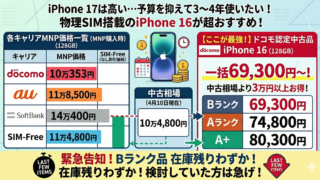 お得情報 【特価】NTTドコモ「iPhone16」認定中古品MNP一括69,300円。物理SIM搭載で需要増