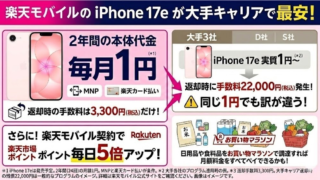(本ページはプロモーションを含みます) ソフトバンクのオンライン専用代理店【スマホ乗り換え.com】が「iPhone 17e」の販売を開始した。 本体価格はMNP月額1円。さらに独自の端末保証に加入すると20,000円をキャッシュバック。(...