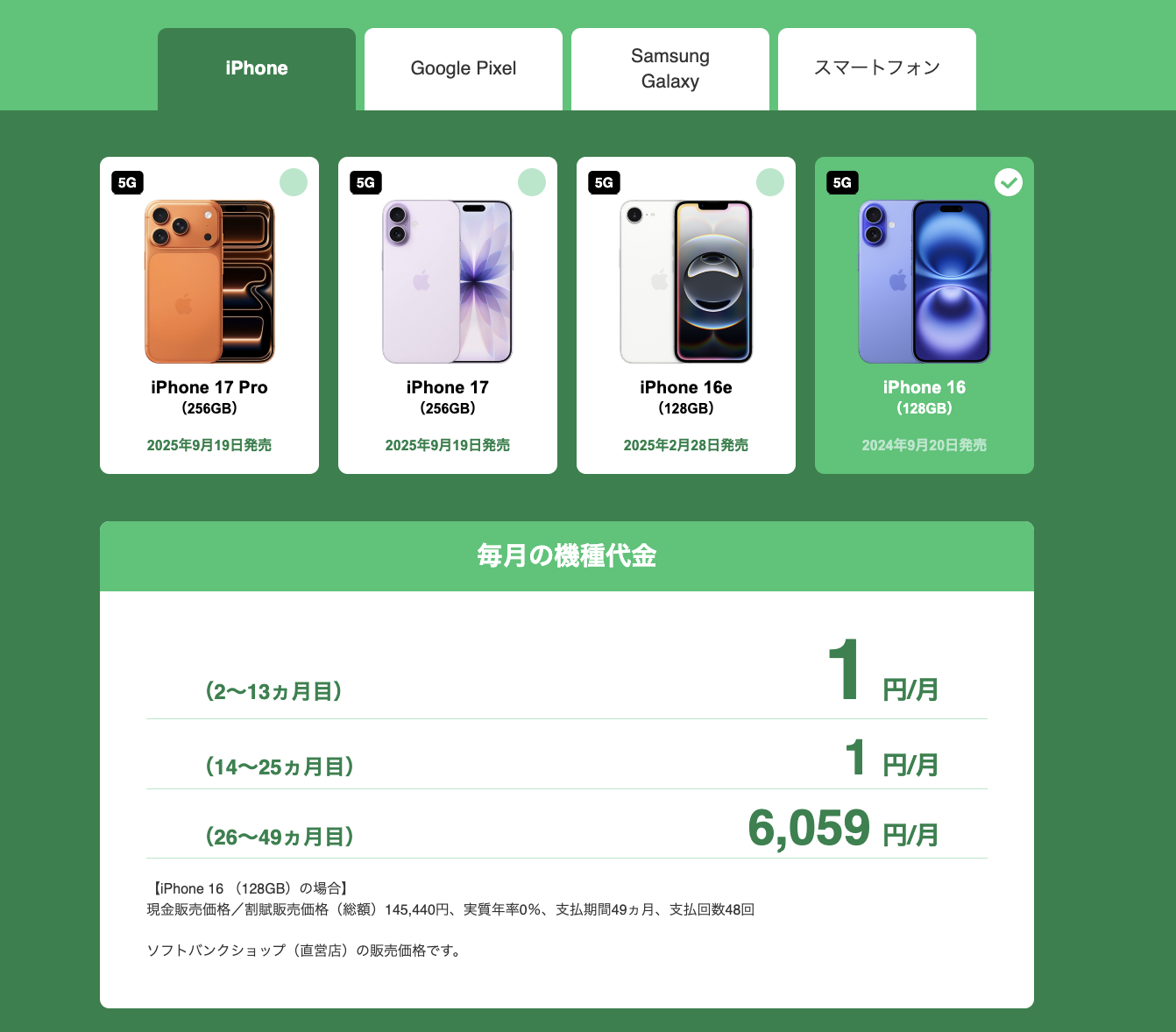 さらにMNP同様の扱いになるため、人気のスマートフォンも端末割引対象。例えば「iPhone 16」128GBが2年間24円。