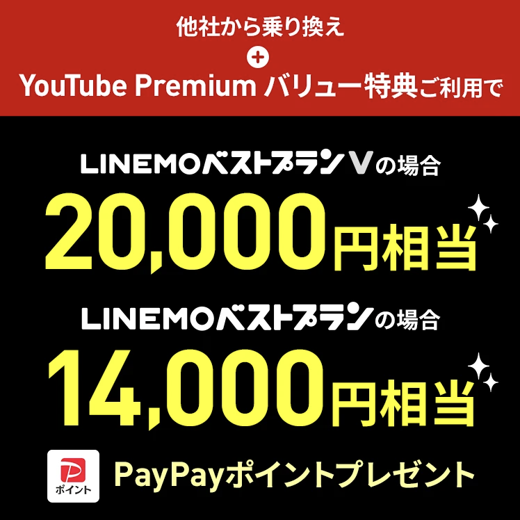 他社からの乗り換えを条件に最大20,000円相当を還元。さらに「Youtube Premium」バリューに加入するとサブスク代金が1ヶ月間無料(2ヶ月目以降も10%OFF)