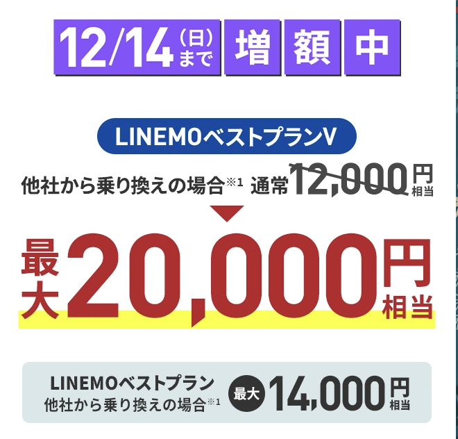 12月14日までの期間中、他社からの乗り換えを条件に最大20,000円相当を還元。