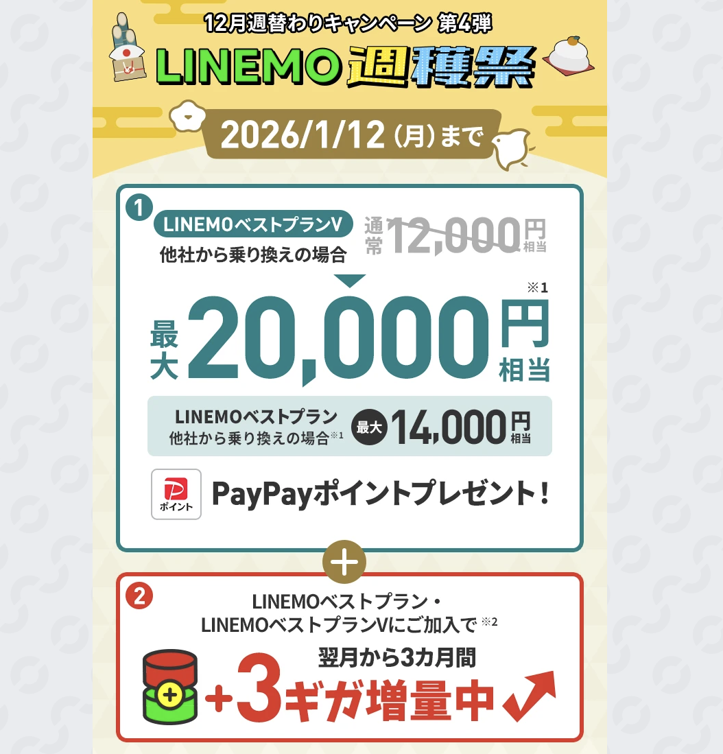 2026年1月12日までの期間中、他社からの乗り換えを条件に最大20,000円相当を還元。