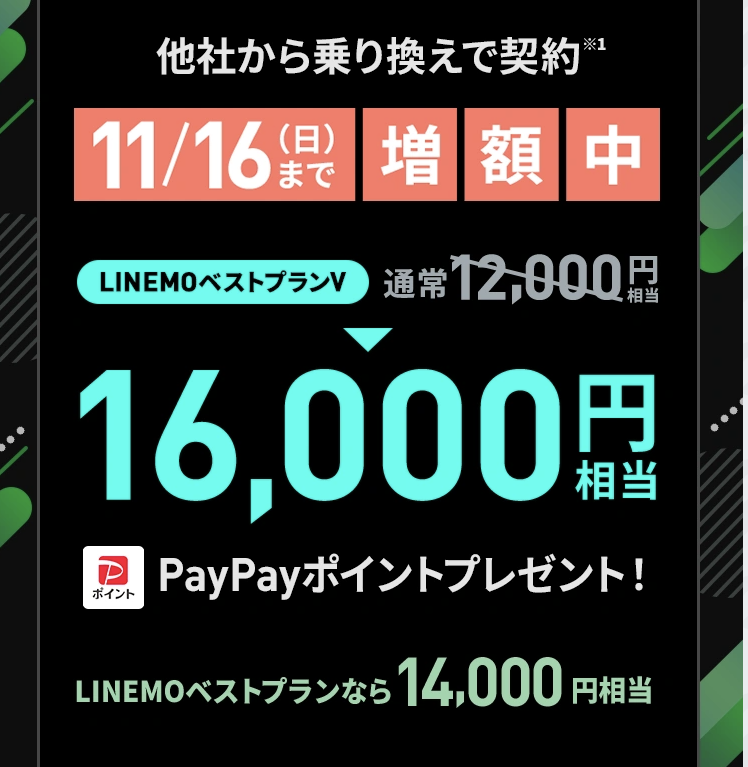 ソフトバンクの格安プラン「LINEMO」が本日より新しいキャンペーンを開始した。11月16日までの期間中、乗り換えで貰えるポイントが4,000円分増額。