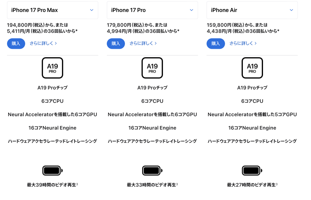 バッテリー容量は当然「iPhone17」シリーズでも群を抜いており「iPhone Air」との比較では最大12時間も違ってくる。