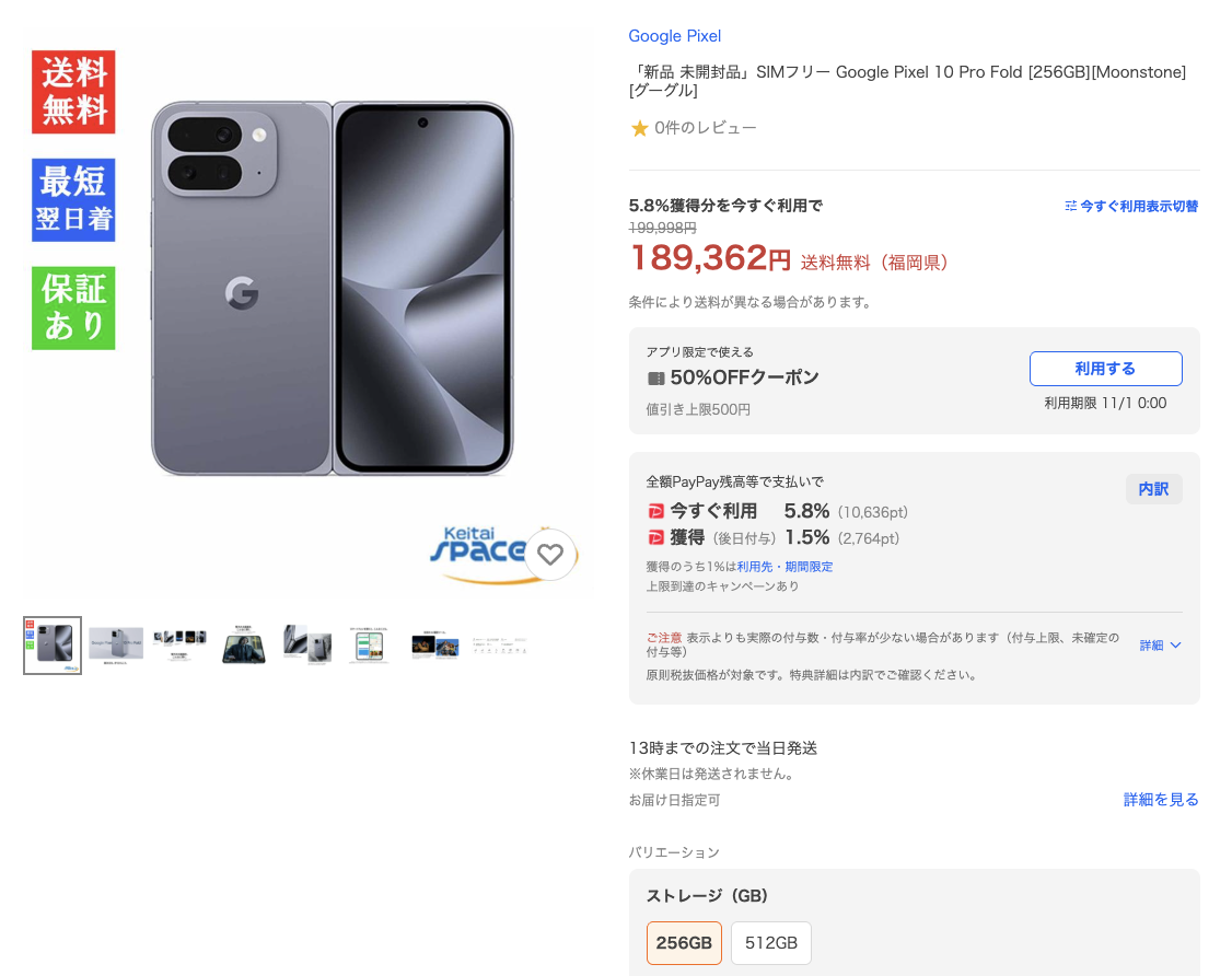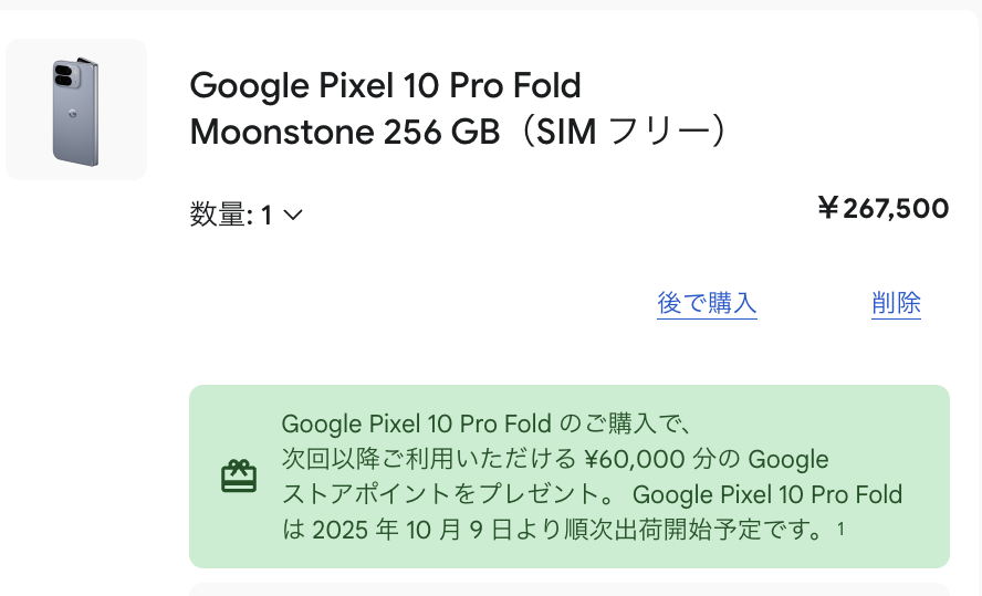 まず最大要因には恒例の「ストアポイント(旧ストアクレジット)」問題が挙げられる。今回「Pixel 10 Pro Fold」には購入特典として60,000円分ものポイントが用意された。