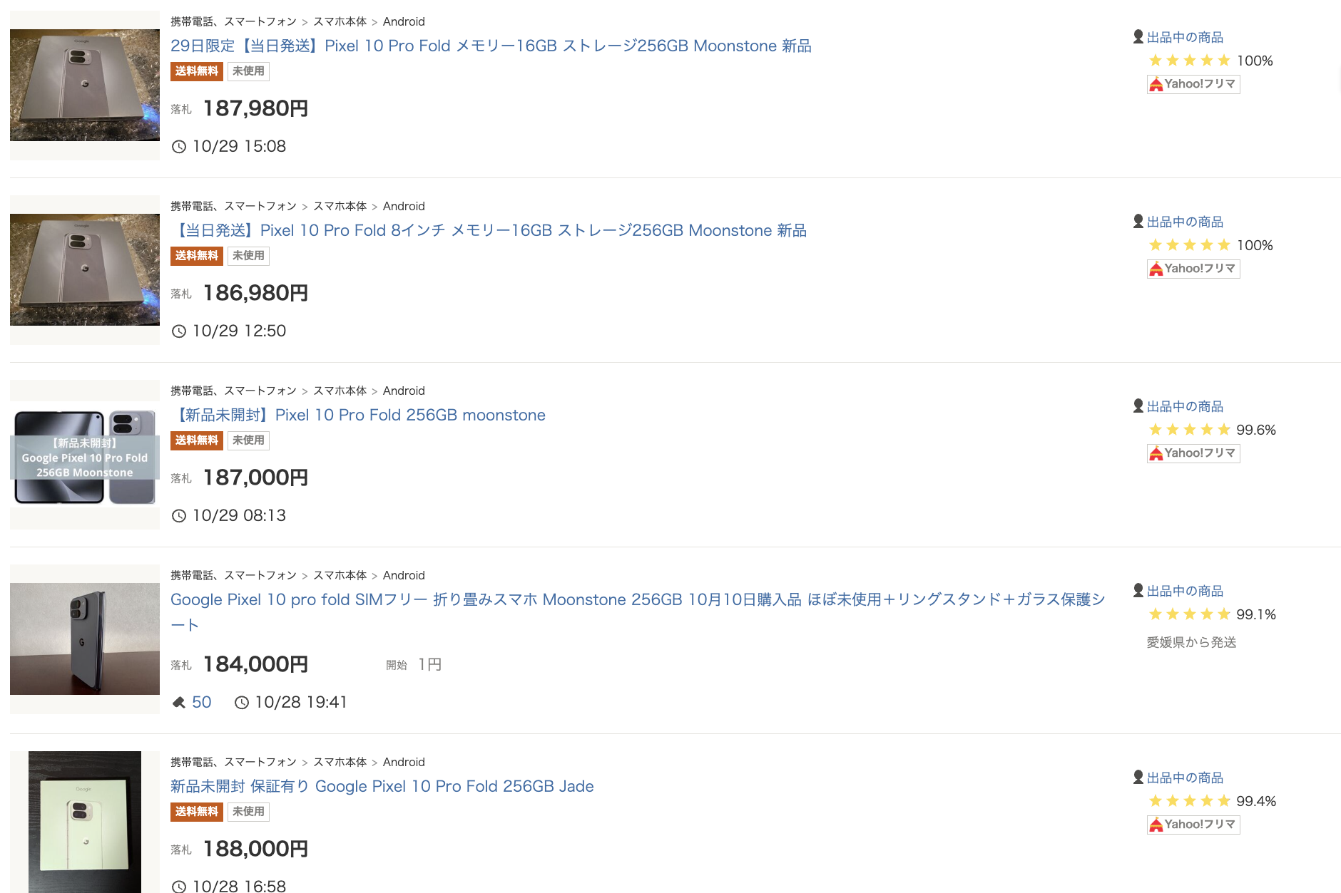ヤフーオークションでも19万円を切り始めており、発売後3週間で7万8,000円も安くなる異常事態。昨年の「Pixel 9 Pro Fold」よりも値下げペースが早まった。