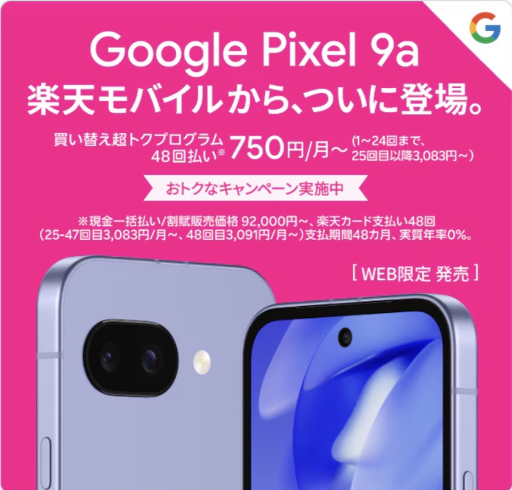 楽天モバイルは「Pixel 9a」の返却プログラム価格を値下げした。発売当時1,572円だった月額料金がMNPを条件に半額の750円。
