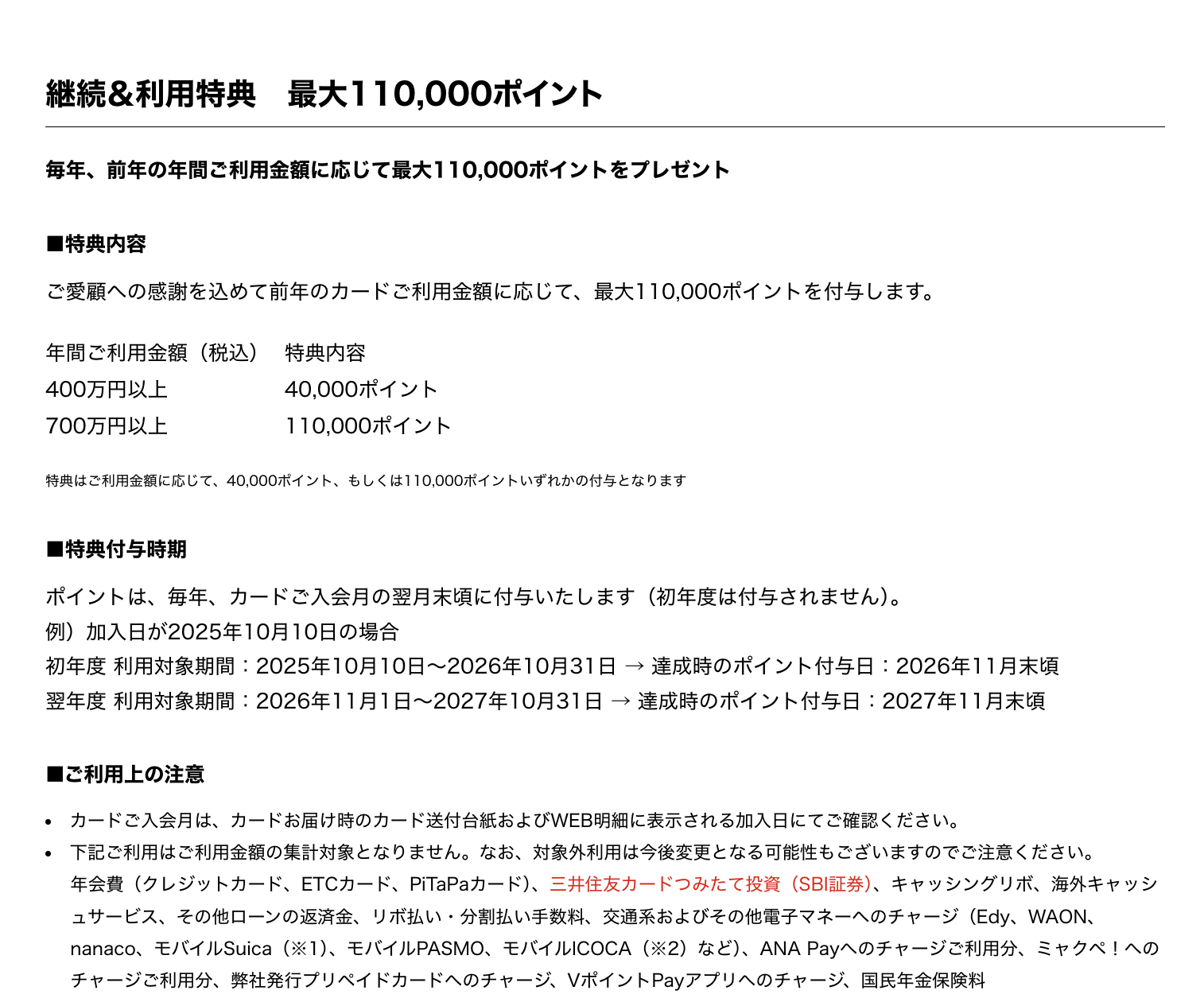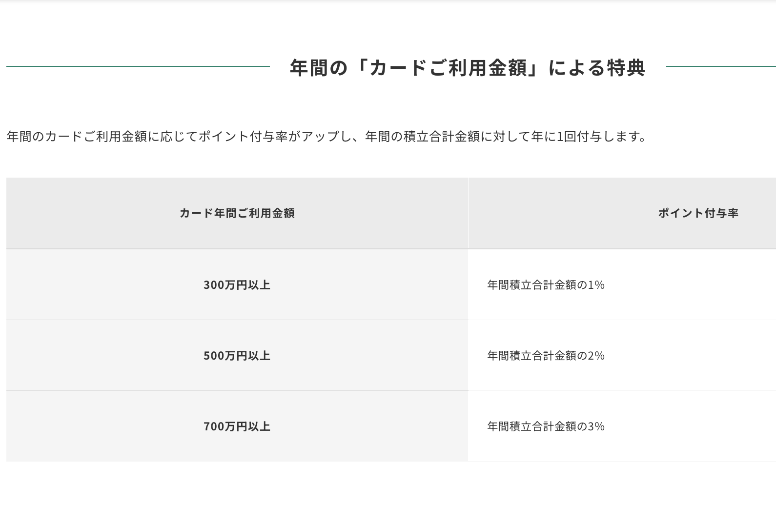 仮に400万円を使った場合、年間獲得ポイントは80,000(通常 40,000 + ボーナス 40,000)円分。ここまでの金額を使って2%維持できるカードは珍しい。