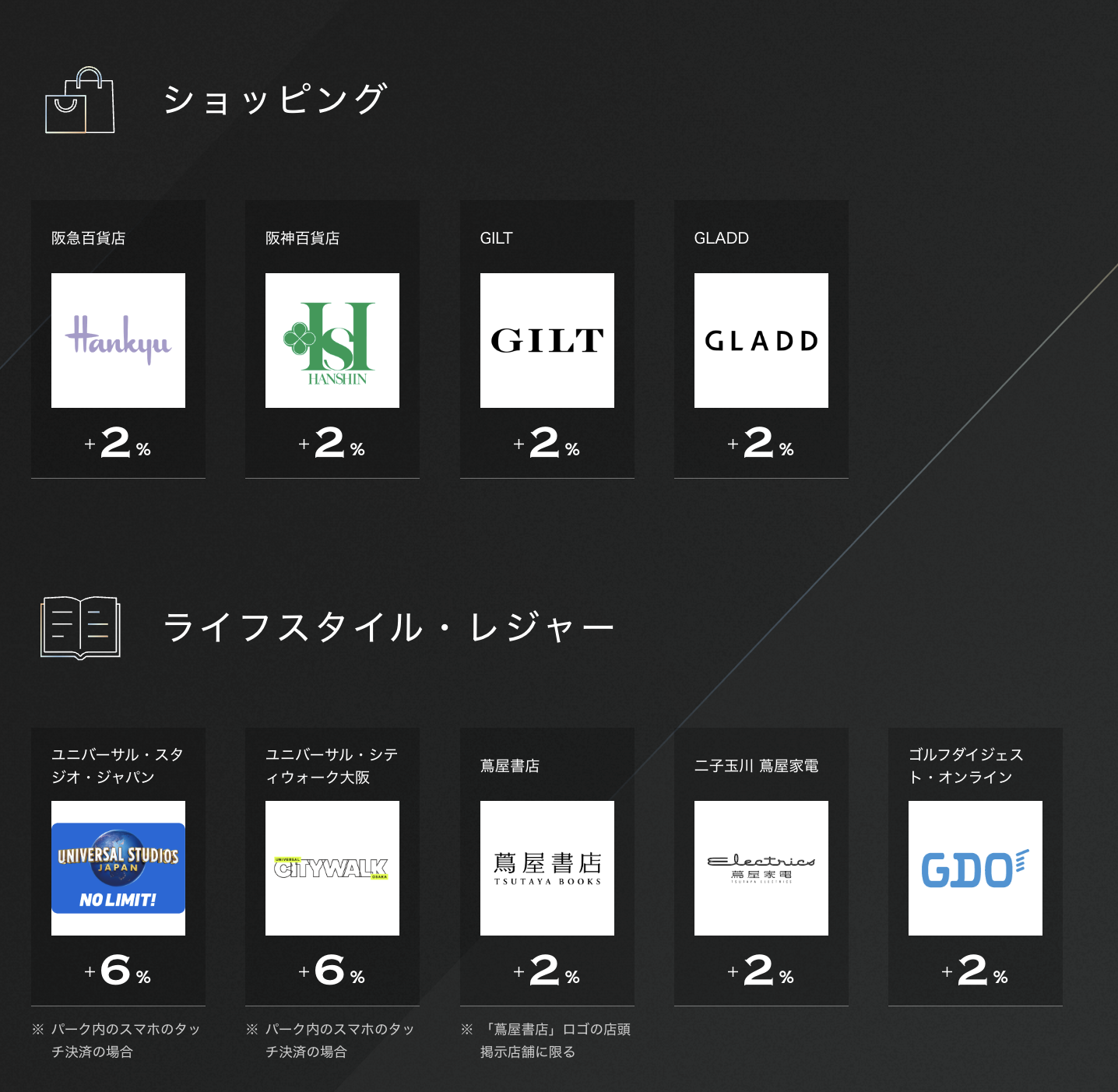 ただし年会費33,000円の「プラチナ・プリファード」には存在するポイントUP特約店が「VISA Infinite」には用意されていない。