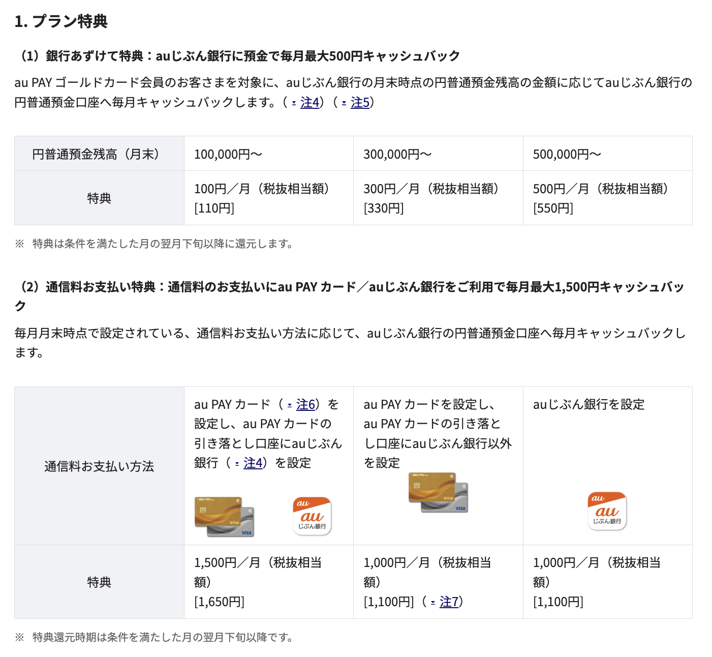 まず今回の見どころは「auじぶん銀行」特典だろう。月末時点の残高に合わせたキャッシュバックが用意され、50万円を維持すれば毎月550円(年間6,600円)が戻ってくる。