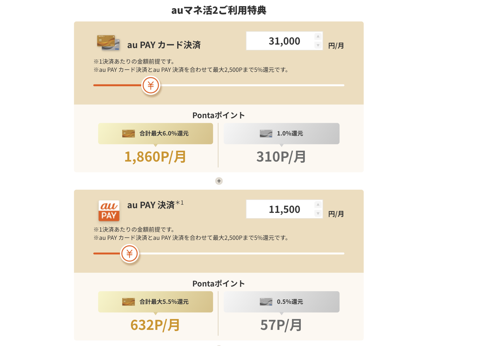 「au PAYゴールドカード」・「au PAY」の利用金額41,000〜43,000円が5%獲得上限の目安になる。