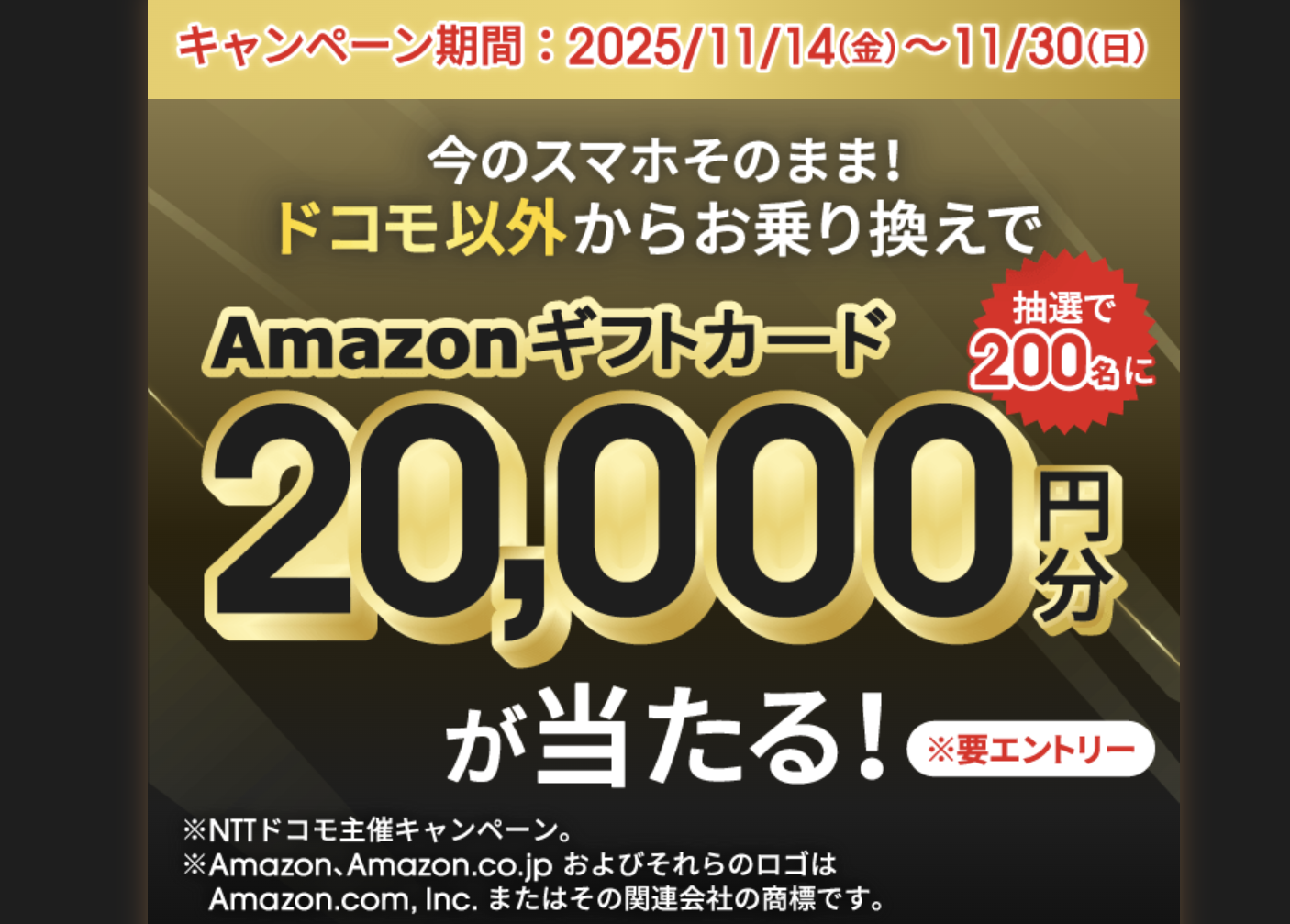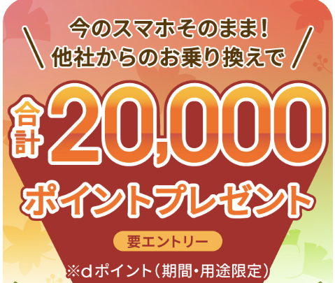 現在、抽選で20,000ポイント貰える(要エントリー)キャンペーンも開催中。ahamoプラン申し込みで当選率が2倍になるため、好条件の今がチャンスかもしれない。