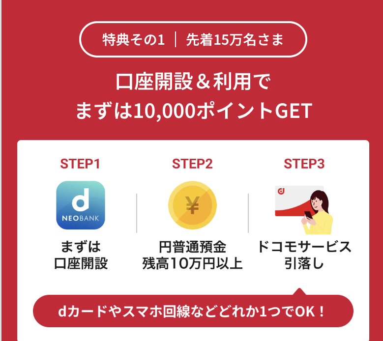 さらに注目したいのが「d NEOBANK」関連のキャンペーンだ。期間中に新規口座開設+10万円預金+スマホ料金やdカードの引き落とし先設定で10,000P獲得。(先着15万名)