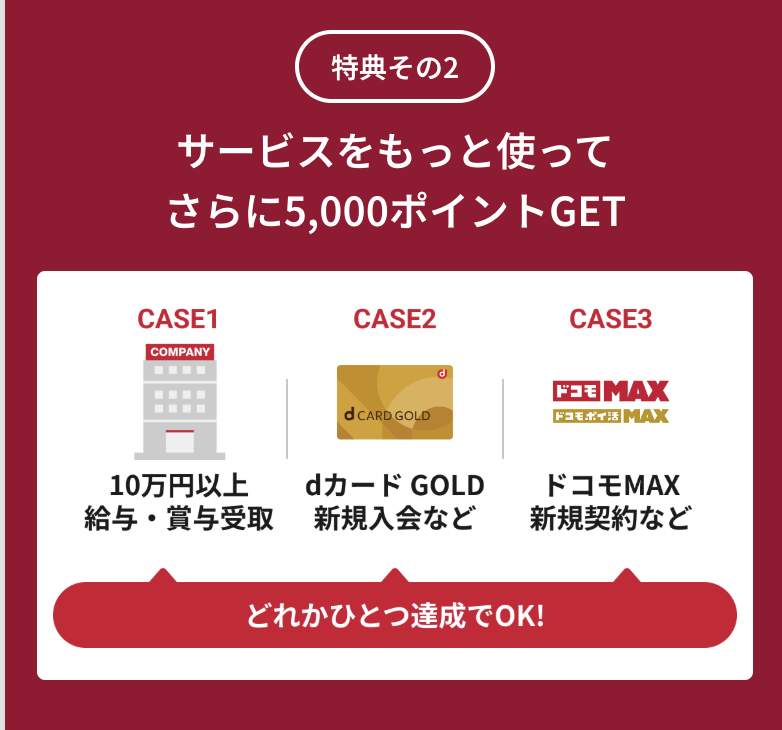 さらにdカードゴールド作成 or 給与受け取り設定 or ドコモMAX契約で5,000P獲得。給与受け取りは会社都合で難しい人もdカードゴールドは元が取りやすくてお勧め。