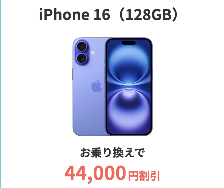 現在、ロングセラーとなっているのが「iPhone 16」128GBで、MNP月額1円で販売中。2年後に返却すれば追加料金なし。通信費込みで月額2,981円の破格である。