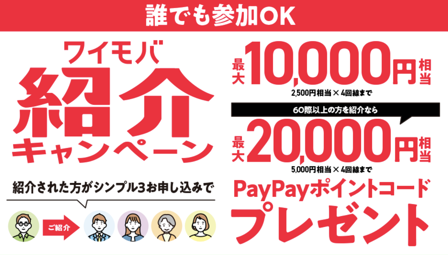 さらに紹介した紹介した人数に応じて最大20,000P貰えるキャンペーンにも注目。ワイモバイル回線の有無に関わらず、1人紹介すると2,500P獲得。