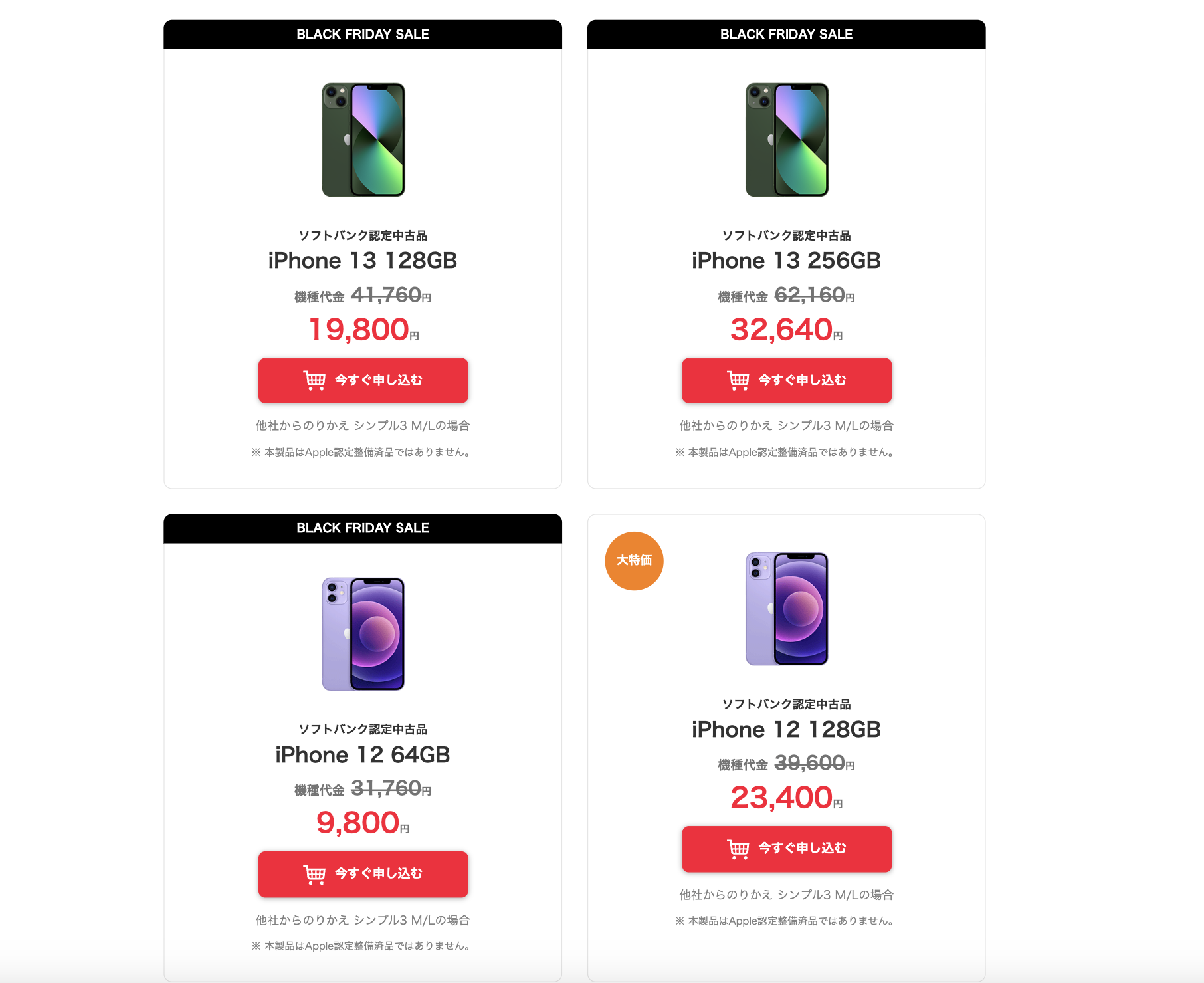ワイモバイルのブラックフライデーセールにて、ソフトバンク認定中古「iPhone12」「iPhone13」の一部容量がMNP特価になっている。