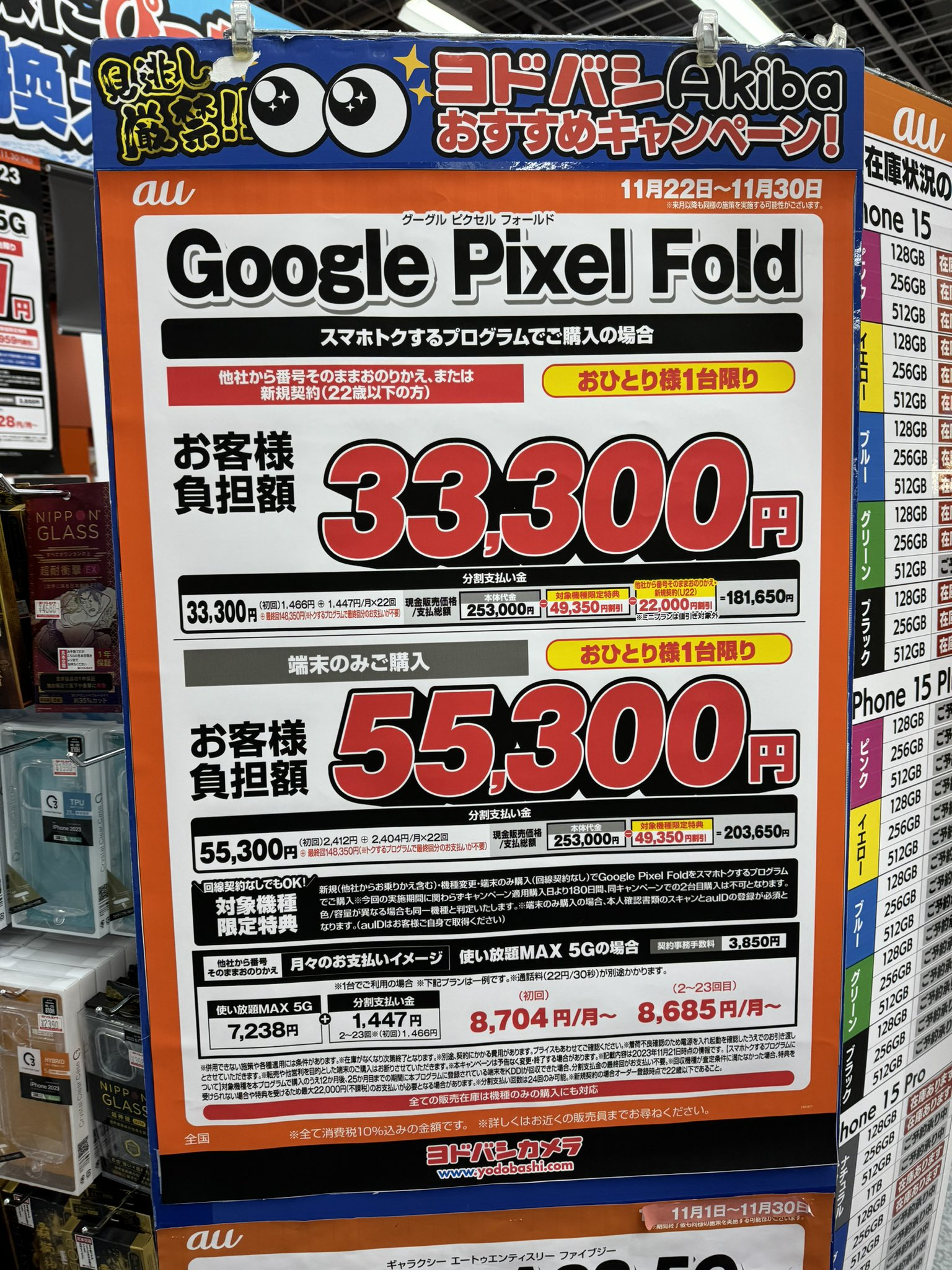 2年前の11月25日、筆者は秋葉原のヨドバシカメラでau「Pixel Fold」をレンタルした。法律で白ロム割引規制が施行される直前。