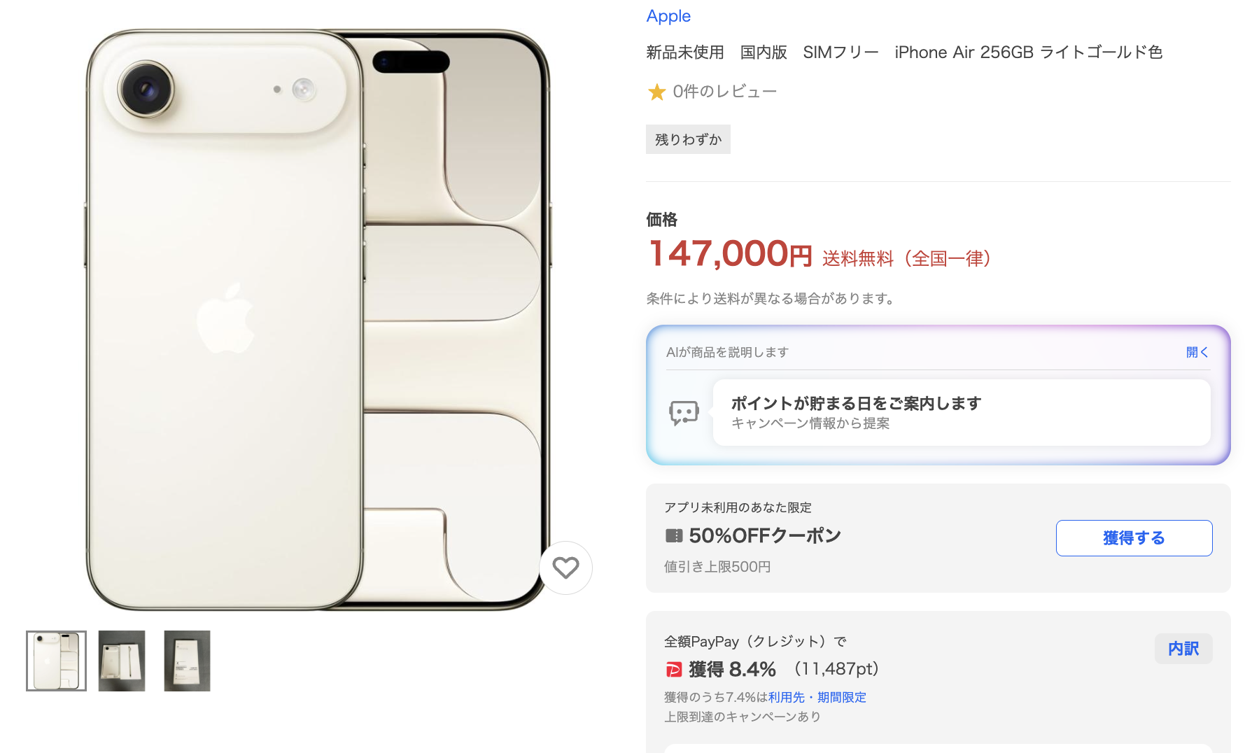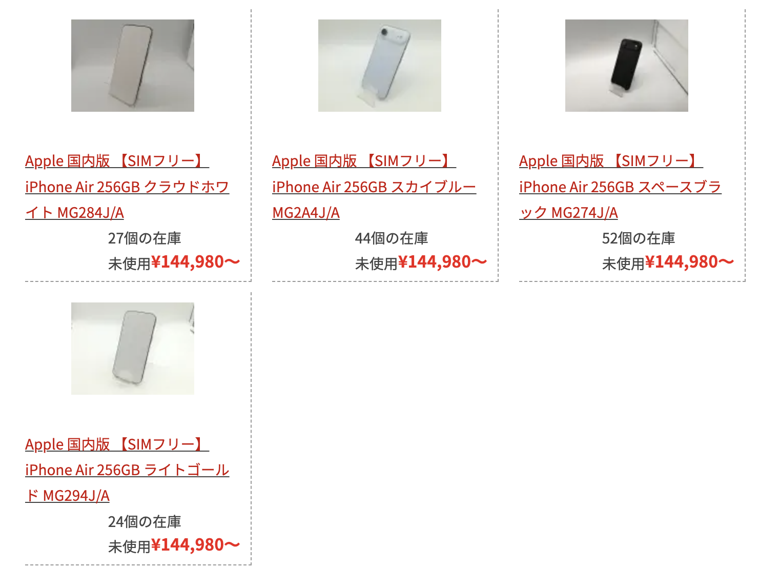 結論から書くと「iPhone Air」相場は未使用品 14万5,000円前後で推移している。10月下旬の14万9,980円から下落が止まり、白ロム大手「じゃんぱら」「イオシス」ともに横並びの状態だ。