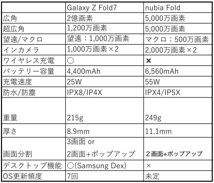 今回は「Galaxy Z Fold7」と比較しながら驚くべき完成度をレビューしたい。総合力の「Galaxy」をとるか、コスパの「nubia」をとるか参考になればと思う。