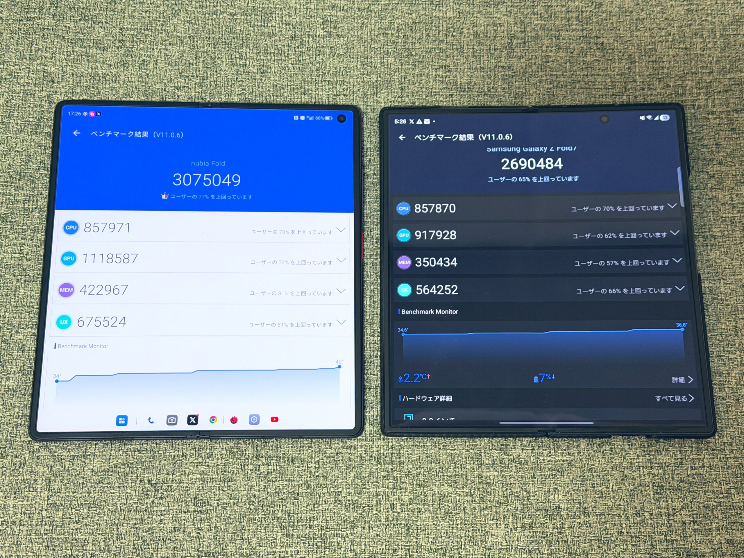 流石に「Snapdragon 8 Elite」だけあって操作性はヌルヌル、サクサク。Antutuベンチマークは307万スコアを記録し「Galaxy Z Fold7」に大きく差をつけた。