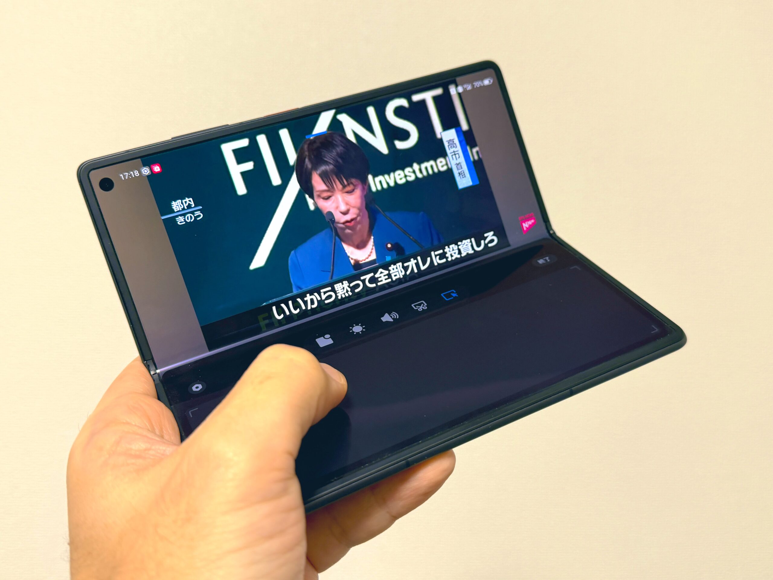 閉じた状態でもアプリを上下に分割可能。丸みを帯びた側面のおかげで本体は開きやすく、画面分割時のアプリサイズも見やすい印象である。