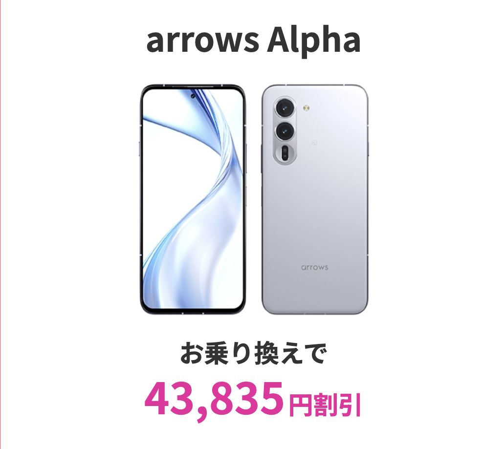 iPhone以外だと「arrows Alpha」のMNP割引金額も43,835円に増額された。割引適用後の一括価格は41,360円、返却プログラムは2年間・月額1円。