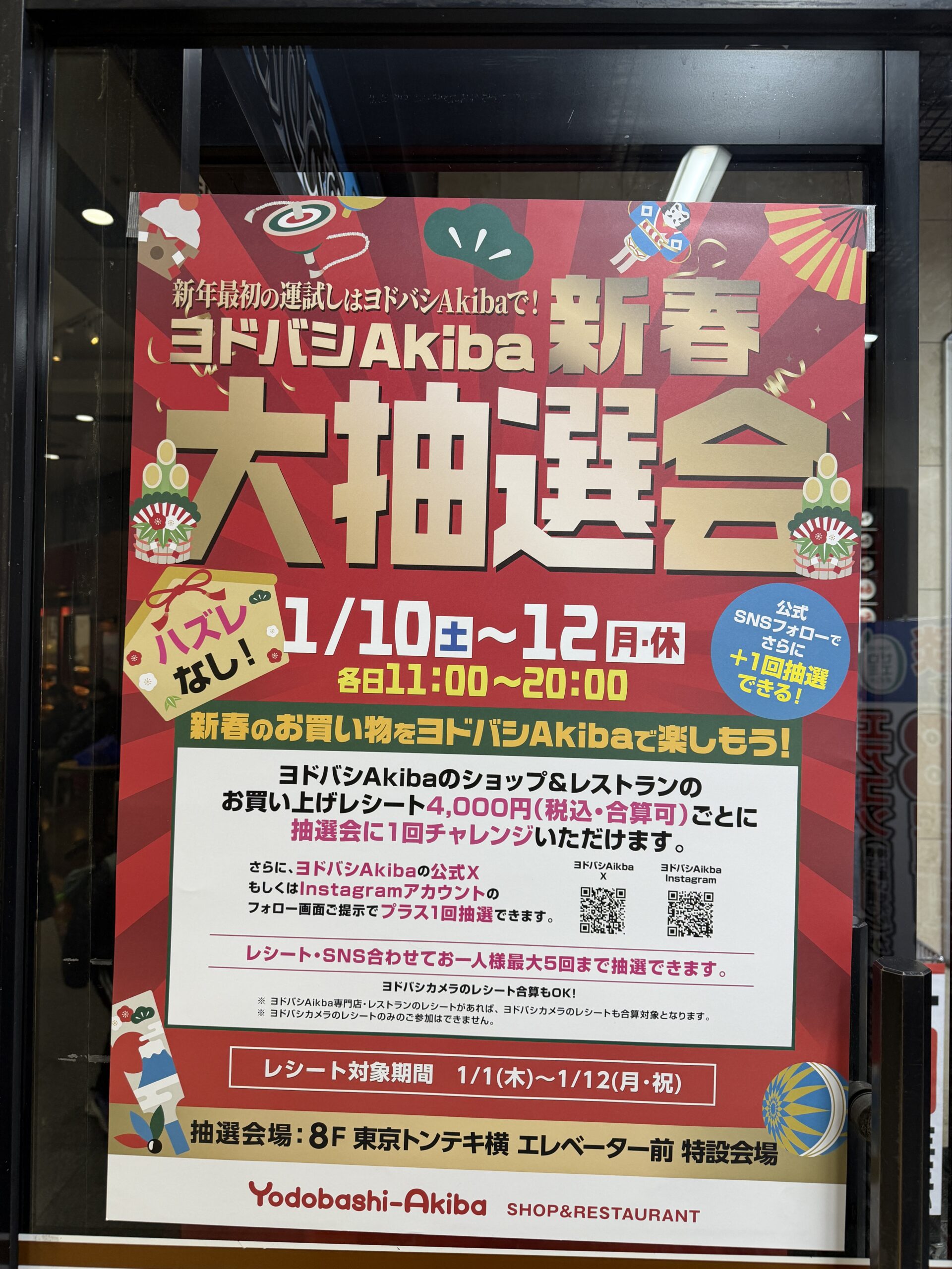 開催は1月10日〜1月12日までの3日間。参加条件は1月1日〜1月12日までに合計4,000円以上の買い物(飲食)をすること。ヨドバシカメラのレシート合算でもOKとある。