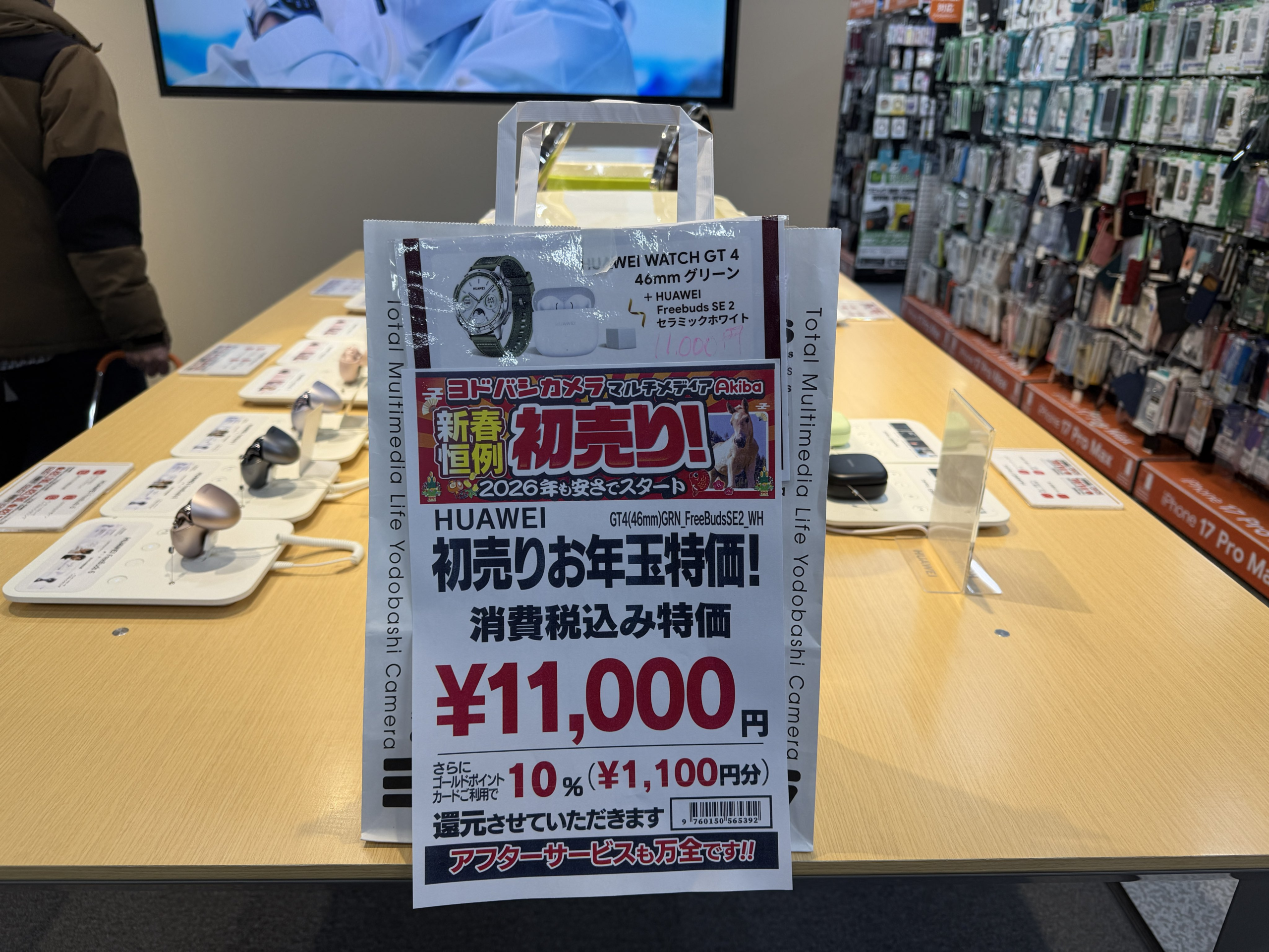 1F入口のファーウェイコーナーでは「Huawei WATCH GT 4 46mm」と「Huawei Freebuds SE2」セットが11,000円。当然ながら実機を試すことができるため、ECサイトのセールにイマイチ興味がなかった方もチェックしてみよう。