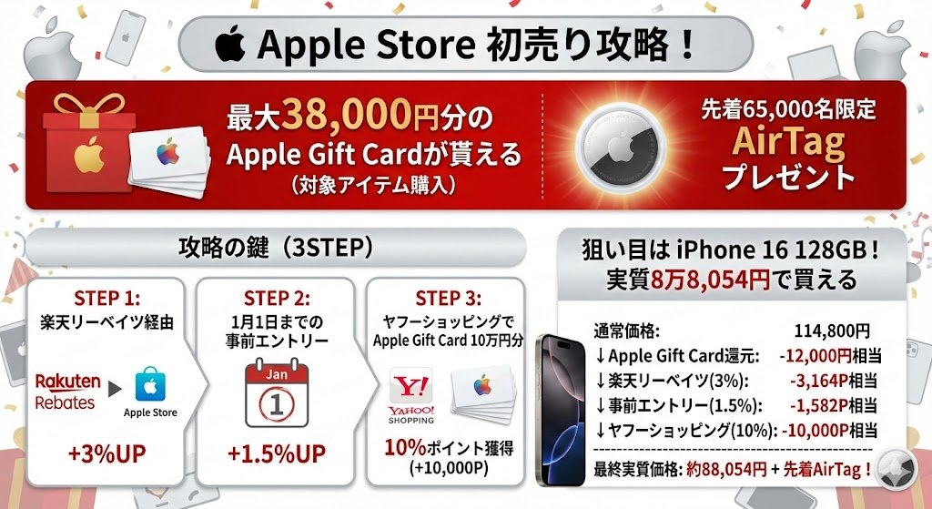 2026年もアップル初売りが大きな盛りがりを見せた。今回はヤフーショッピングで「Apple Gift Card」を事前購入すれば誰でも10%ポイント獲得できた。