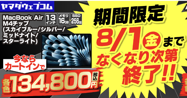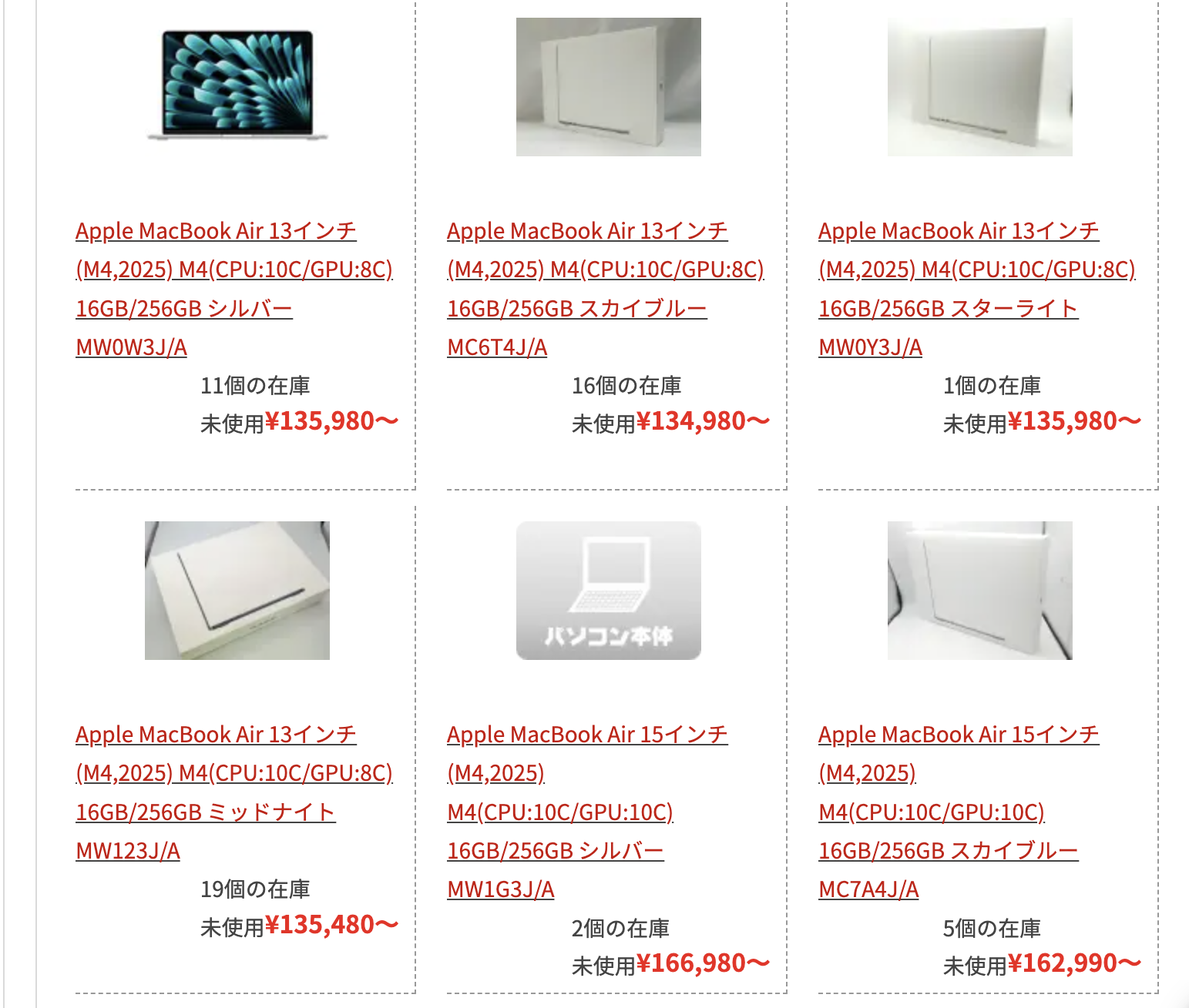 MacBookも同様だ。例えば昨年「M4 MacBook Air」SSD256GB/メモリ16GBは何度もAmazonや一部家電量販店で13万円台のセール対象となった。