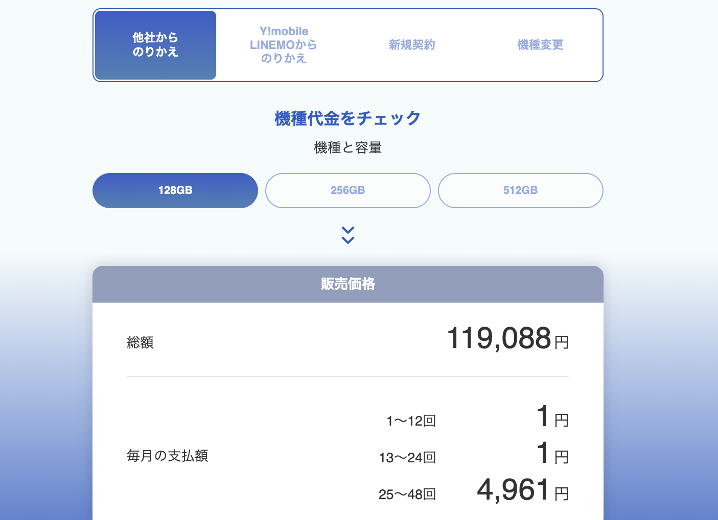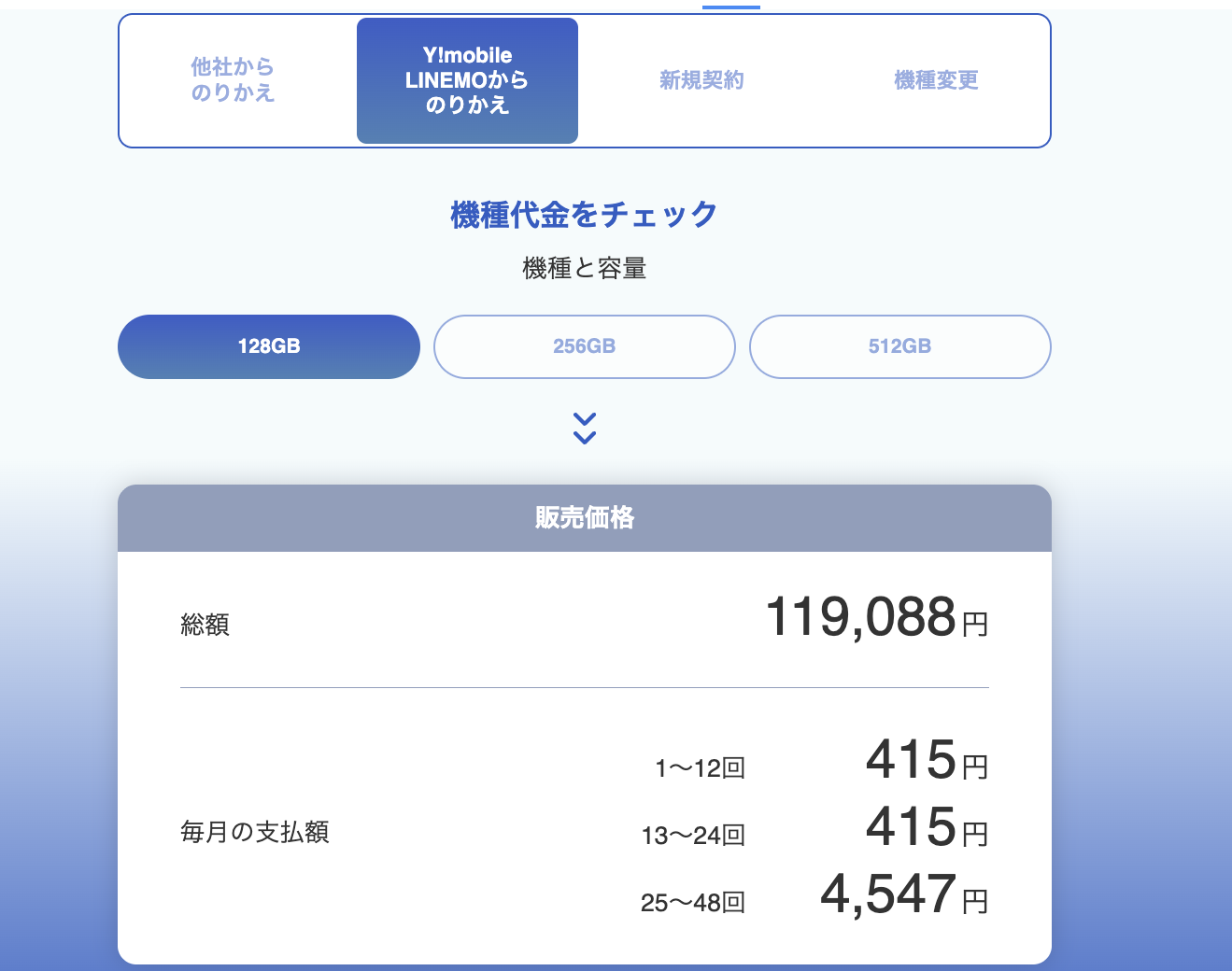 ところが新しく追加された項目「Y!mobile LINEMOからのりかえ」をタップすると月額415円に変更されているのだ。