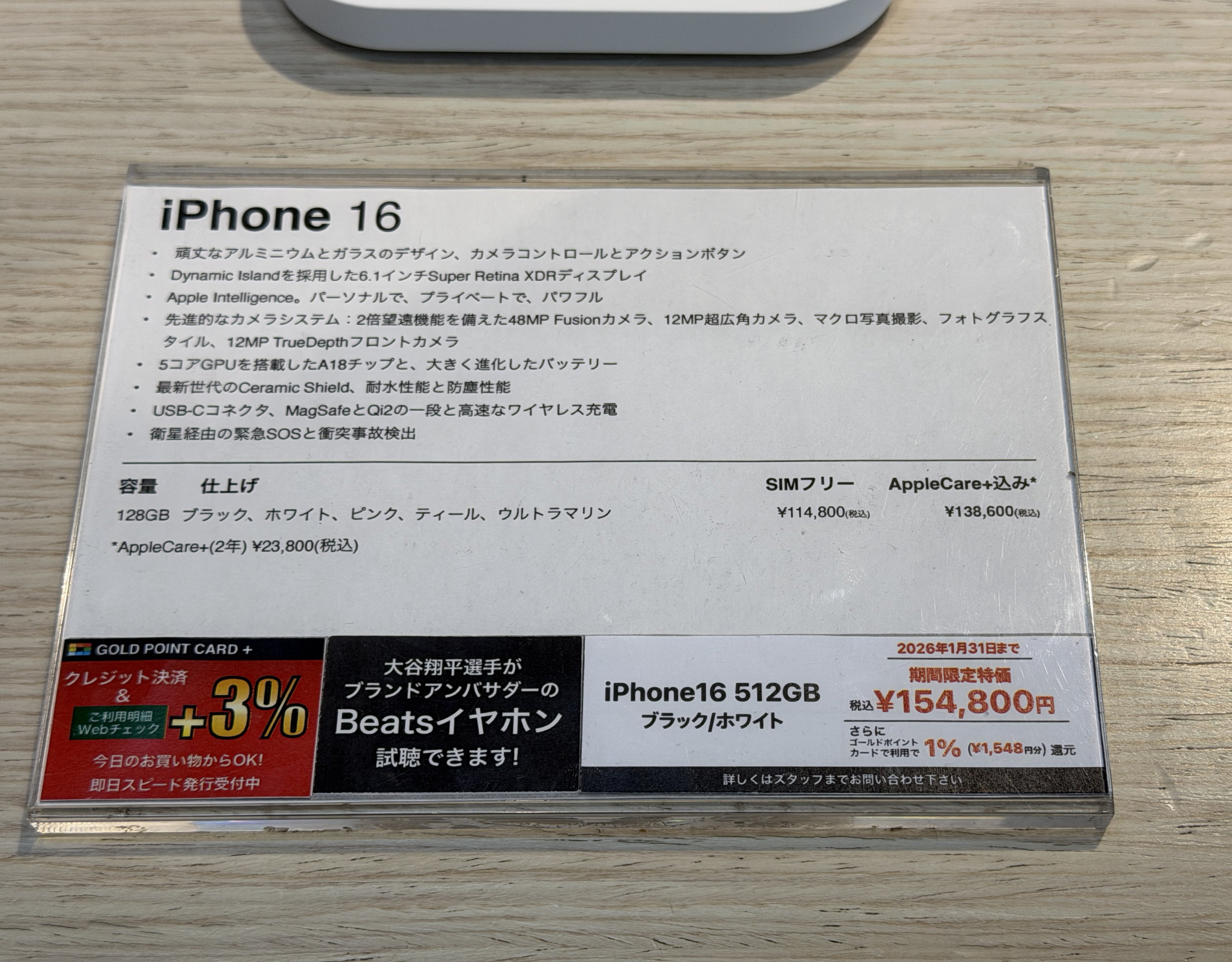 またアップルコーナーでは生産・販売終了の「iPhone 16」512GBが1万円OFF 15万4,800円。アップル製品だけあってお得感が少ないものの、ヨドバシクレカ決済で+3%獲得できる。