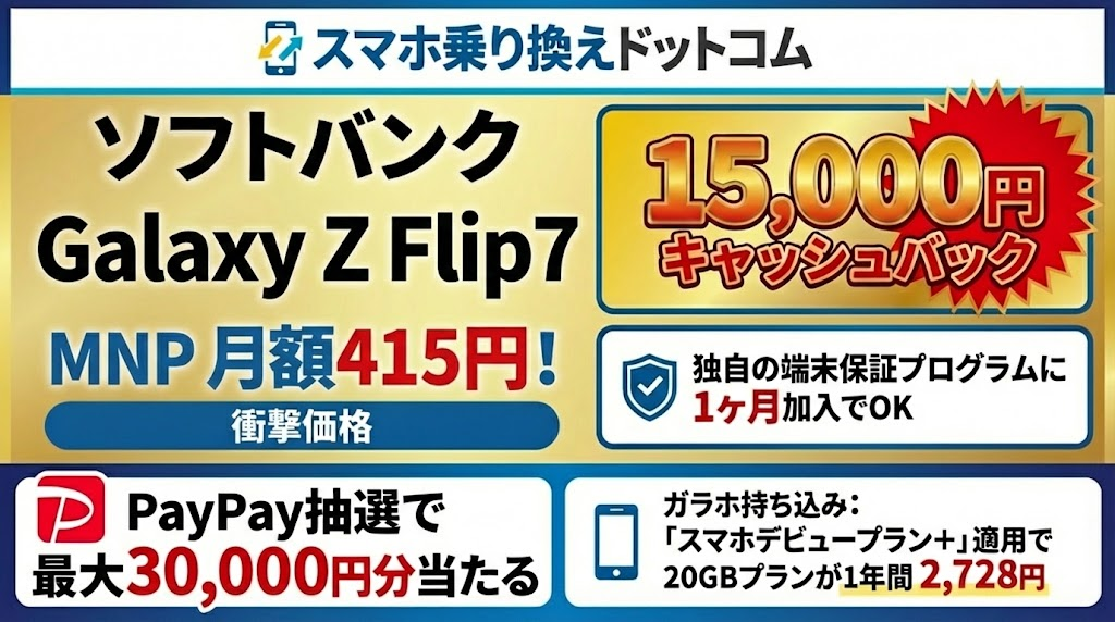 ソフトバンクのフォルダブル「Galaxy Z Flip7」が引き続き激アツ価格になっている。まず他社からMNPで2年間の本体価格が月額415円。さらにオンライン専用代理店「スマホ乗り換えドットコム」で申し込むと15,000円のキャッシュバック付き。