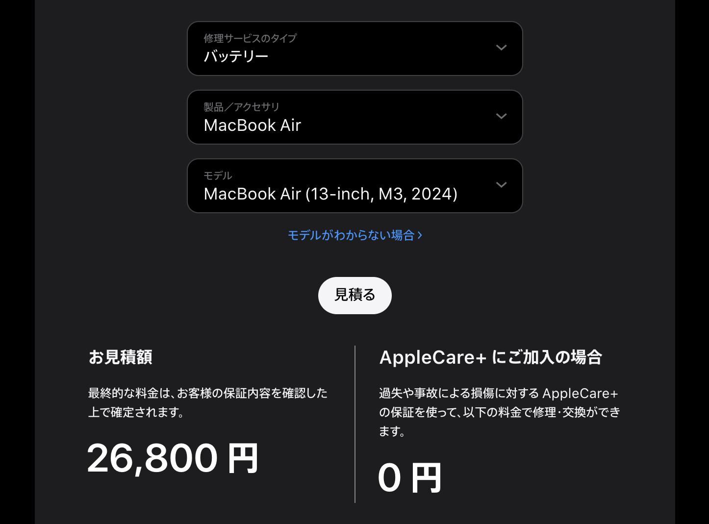 筆者はとにかく外出先での作業が多く、このままでは生活にも支障をきたしてしまう。そこでバッテリー交換を検討してみたのだが、アップル公式サイトの修理費用は26,800円。覚悟はしていたがけっこうするものだ。
